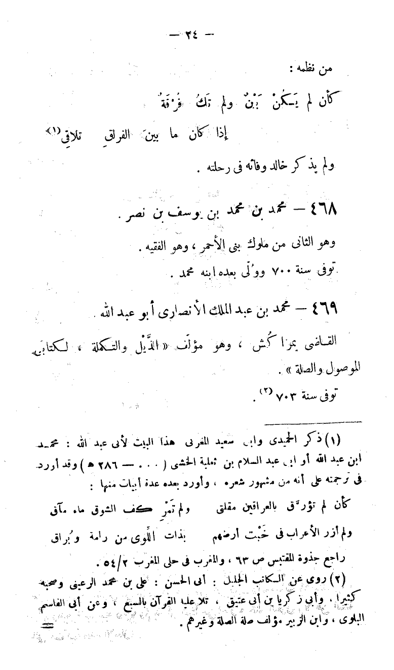 (1) ذكر الحميدى وابن سعيد المغربى هذا البيت لأبى عبد الله: محمد ابن عبد الله أو ابن عبد السلام بن ثعلبة الخشى (. . . -286 هـ) وقد أورد فى ترجمته على أنه من مشهور شعره، وأورد بعده عدة أبيات منها: كأن لم تؤرّق بالعراقين مقلتى ولم تمر كف الشوق ماء مآق ولم أزر الأعراب فى خبت أرضهم بذات اللّوى من رامة وبراق راجع جذوة المقتبس ص 63، والمغرب فى حلى المغرب 2/ 54.