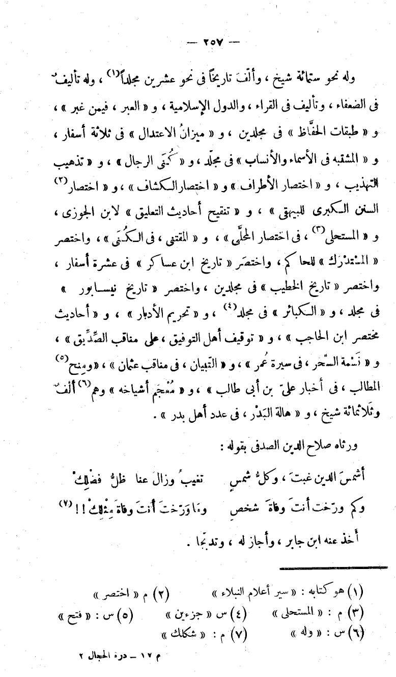 وله نحو ستمائة شيخ، وألّف تاريخا فى نحو عشرين مجلدا (1)، وله تأليف فى الضعفاء، وتأليف فى القراء، والدول الإسلامية، و «العبر، فيمن غبر»، و «طبقات الحفّاظ» فى مجلدين، و «ميزان الاعتدال» فى ثلاثة أسفار، و «المشتبه فى الأسماء والأنساب» فى مجلّد، و «كنى الرجال»، و «تذهيب التهذيب، و «اختصار الأطراف» و «اختصار الكشاف»، و «اختصار (2) السنن الكبرى للبيهقى»، و «تنقيح أحاديث التعليق» لابن الجوزى، و «المستحلى (3)، فى اختصار المحلّى»، و «المقتنى، فى الكنى»، واختصر «المستدرك» للحاكم، واختصر «تاريخ ابن عساكر» فى عشرة أسفار، واختصر «تاريخ الخطيب» فى مجلدين، واختصر «تاريخ نيسابور» فى مجلد، و «الكبائر» فى مجلد (4)، و «تحريم الأدبار»، و «أحاديث مختصر ابن الحاجب»، و «توقيف أهل التوفيق، على مناقب الصّدّيق»، و «نسمة السّحر، فى سيرة عمر»، و «التّبيان، فى مناقب عثمان»، «ومنح (5) المطالب، فى أخبار علىّ بن أبى طالب»، و «معجم أشياخه» وهم (6) ألف وثلاثمائة شيخ، و «هالة البدر، فى عدد أهل بدر».