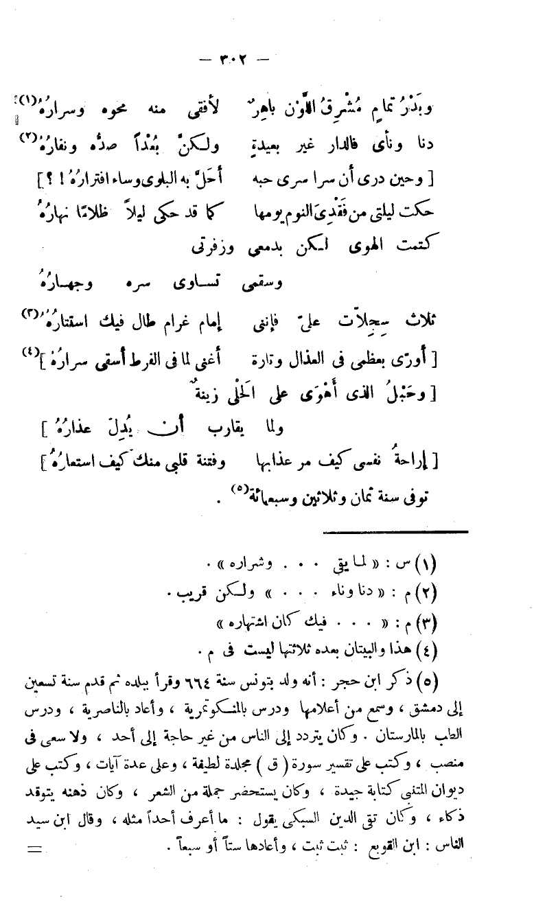 (5) ذكر ابن حجر أنه ولد بتونس سنة 664 وقرأ ببلده ثم قدم سنة تسعين إلى دمشق، وسمع من أعلامها ودرس بالمنكوتمرية، وأعاد بالناصرية، ودرس الطب بالمارستان؟ ؟ ؟ ؟ ؟ ؟ إلى الناس من غير حاجة إلى أحد، ولا سعى فى منصب، وكتب على تفسير سوره (فى) مجلده لطيفة، وعلى عده آيات، وكتب على ديوان المتنبى كتابة جيده، وكان يستحضر جملة من الشعر، وكان ذهنه يتوقد ذكاء، وكان تقى الدين السبكى يقول ما أعرف أحدا مثله، وقال ابن؟ ؟ ؟ الناس ابن القويع؟ ؟ ؟ ، وأعادها ستا أو سبعا.