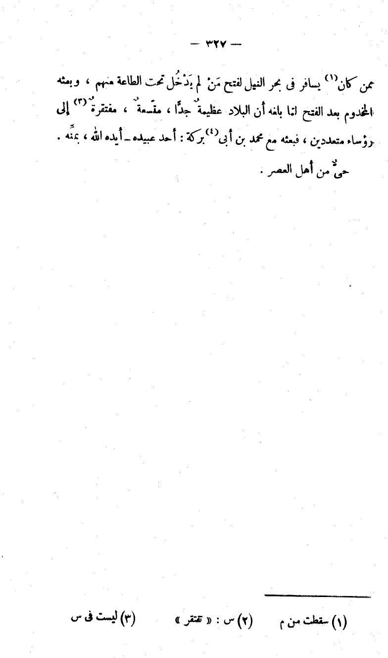 ممن كان (1) يسافر فى بحر النيل لفتح من لم يدخل تحت الطاعة منهم، وبعثه المخدوم بعد الفتح لمّا بلغه أن البلاد عظيمة جدّا، متّسعة، مفتقرة (2) إلى رؤساء متعددين، فبعثه مع محمد بن أبى (3) بركة: أحد عبيده-أيده الله، بمنّه.
