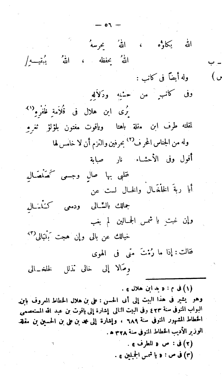 (1) فى م: «يد ابن هلال». وهو يشير فى هذا البيت إلى أبى الحسن: على بن هلال الخطاط المعروف بابن البواب المتوفى سنة 423 وفى البيت التالى إشارة إلى ياقوت بن عبد الله المستعصمى الخطاط المشهور المتوفى سنة 689، وإشارة إلى محمد بن على بن الحسين بن مقلة الوزير الأديب الخطاط المتوفى سنة 328 هـ.