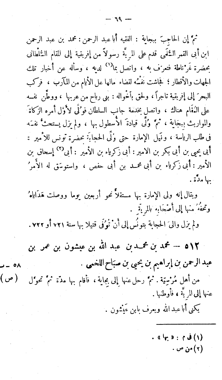 ثمّ إن الحاجب ببجاية: الفقيه أبا عبد الرحمن: محمد بن عبد الرحمن ابن أبى القمر السّلمى قدم على المريّة رسولا من إفريقية إلى المقام السّلطانى بحضرة غرناطة فتعرّف به، واتصل بما (1) لديه، وسأله عن أخبار تلك الجهات والأقطار؛ فجاشت نفسه لقضاء مالها على الأيام من المآرب، فركب البحر إلى إفريقية تاجرا، ولحق بأخواله: بنى رباح من عربها، ووطّن نفسه على المقام هناك، واتصل بخدمة جانب السلطان فولّى لأوّل أمره الزكاة والمواريث ببجاية، ثمّ ولّى قيادة الأسطول بها، ولم يزل يستحثّ نفسه فى طلب الرياسة، ونيل الإمارة حتى ولّى الحجابة بحضرة تونس للأمير: أبى يحيى بن أبى بكر بن الامير: أبى زكرياء بن الأمير: أبى (2) إسحاق بن الأمير: أبى زكرياء بن أبى محمد بن أبى حفص، واستوسق له الأمر بها مدّة.