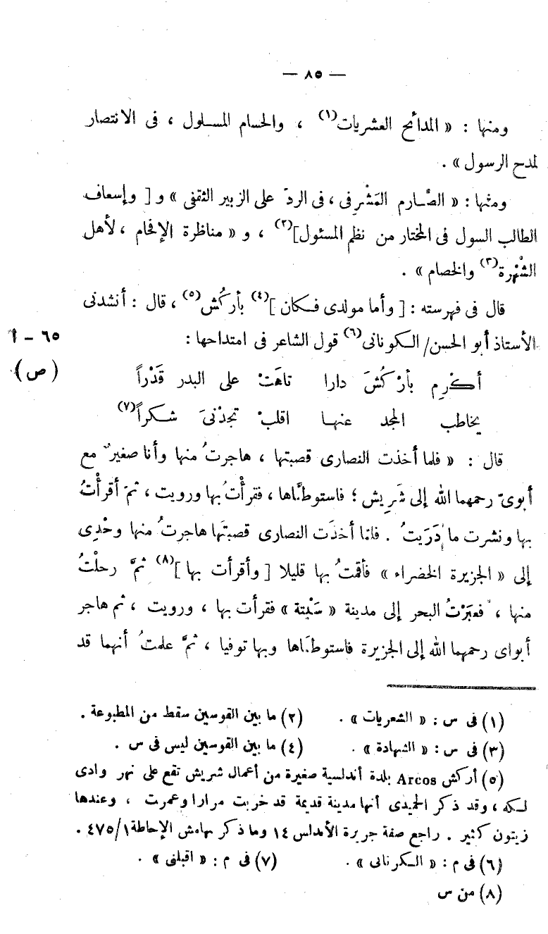 قال فى فهرسته: [وأما مولدى فكان] (4) بأركش (5)، قال: أنشدنى الأستاذ أبو الحسن/الكونانى (6) قول الشاعر فى امتداحها: