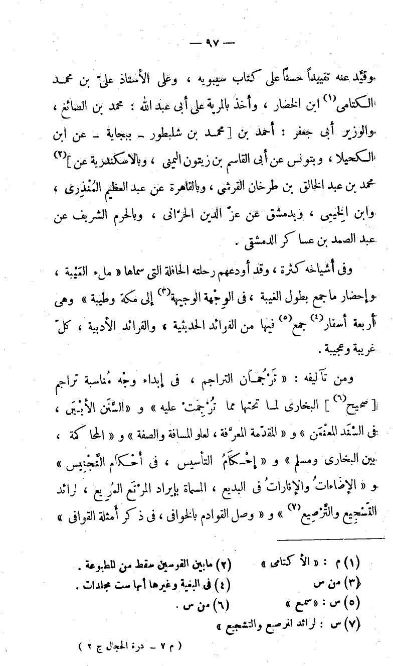 وفى أشياخه كثرة، وقد أودعهم رحلته الحافلة التى سماها «ملء العيبة، وإحضار ما جمع بطول الغيبة، فى الوجهة الوجيهة (3) إلى مكة وطيبة» وهى أربعة أسفار (4) جمع (5) فيها من الفوائد الحديثية، والفرائد الأدبية، كلّ غريبة وعجيبة.