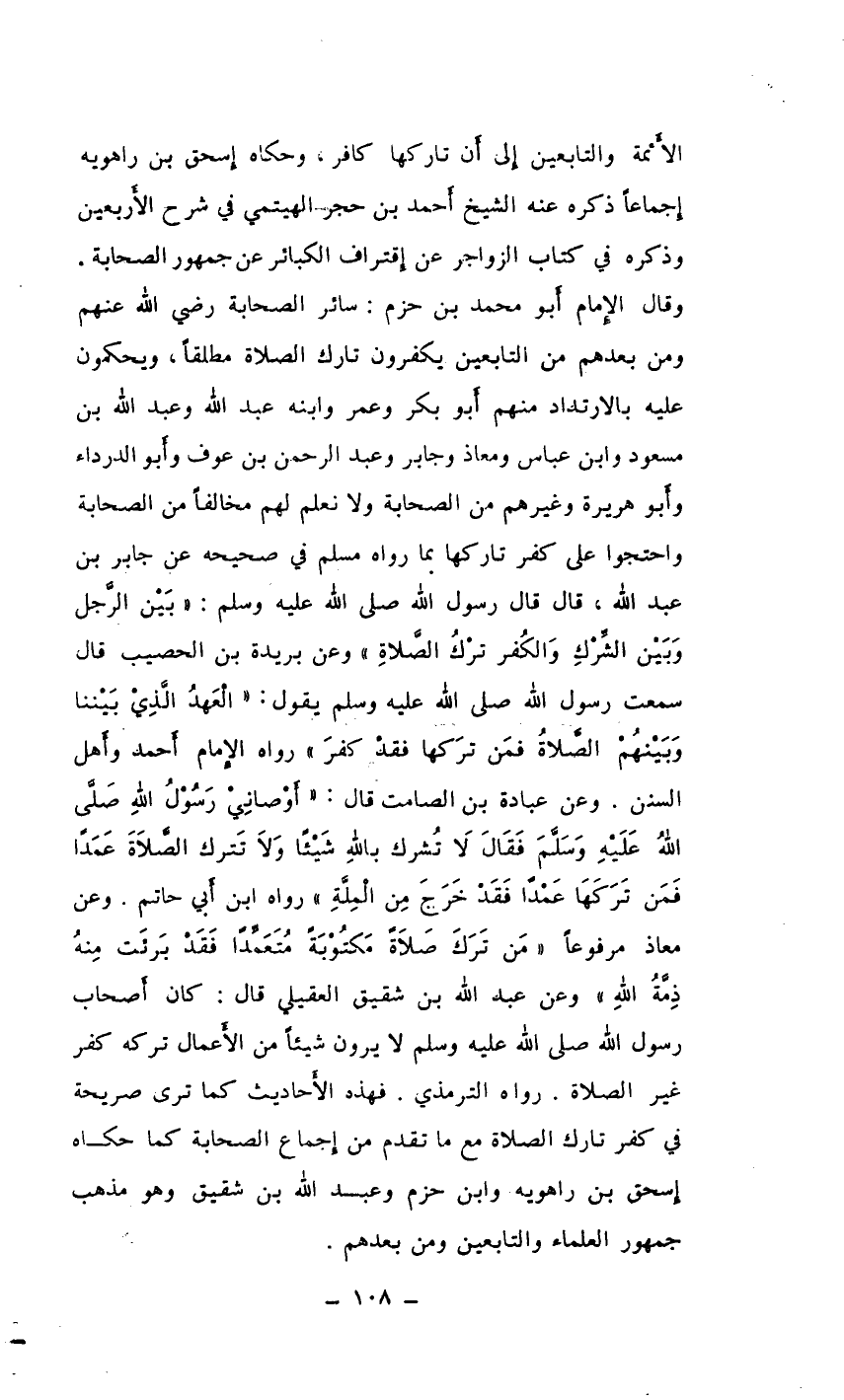 الأَئمة والتابعين إِلى أَن تاركها كافر. وحكاه إِسحق بن راهويه إِجماعًا ذكره عنه الشيخ أَحمد بن حجر الهيثمي في شرح الأَربعين وذكره في كتاب الزواجر عن إِقتراف الكبائر عن جمهور الصحابة. وقال الإِمام أَبو محمد بن حزم: سائر الصحابة رضي الله عنهم ومن بعدهم من التابعين يكفرون تارك الصلاة مطلقًا، ويحكمون عليه بالارتداد منهم أَبو بكر وعمر وابنه عبد الله وعبد الله بن مسعود وابن عباس ومعاذ وجابر وعبد الرحمن بن عوف وأَبو الدرداء وأَبو هريرة وغيرهم من الصحابة ولا نعلم لهم مخالفًا من الصحابة واحتجوا على كفر تاركها بما رواه مسلم في صحيحه عن جابر بن عبد الله، قال قال رسول الله صلى الله عليه وسلم: ((بَيْن الرَّجل وَبَيْن الشِّرْكِ وَالكُفر ترْكُ الصَّلاةِ)) وعن بريدة بن الحصيب قال سمعت رسول الله صلى الله عليه وسلم يقول: ((الْعَهدُ الَّذِيْ بَيْننا وَبَيْنهُمْ الصَّلاةُ فمَن ترَكها فقدْ كفرَ)) رواه الإِمام أَحمد وأَهل السنن. وعن عبادة بن الصامت قال: ((أَوْصانِيْ رَسُوْلُ اللهِ صَلَّى اللهُ عَلَيْهِ وَسَلَّمَ فَقَالَ لاَ تُشرك باللهِ شَيْئًا وَلاَ تَترك الصَّلاَةَ عَمَدًا فَمَن تَرَكَهَا عَمْدًا فَقَدْ خَرَجَ مِن الْمِلَّةِ)) رواه ابن أَبي حاتم. وعن معاذ مرفوعًا ((مَن تَرَكَ صَلاَةً مَكتُوْبَةً مُتَعَمِّدًا فَقَدْ بَرئَت مِنهُ ذِمَّةُ اللهِ)) وعن عبد الله بن شقيق العقيلي قال: كان أَصحاب رسول الله صلى الله عليه وسلم لا يرون شيئًا من الأَعمال تركه كفر غير الصلاة. رواه الترمذي.