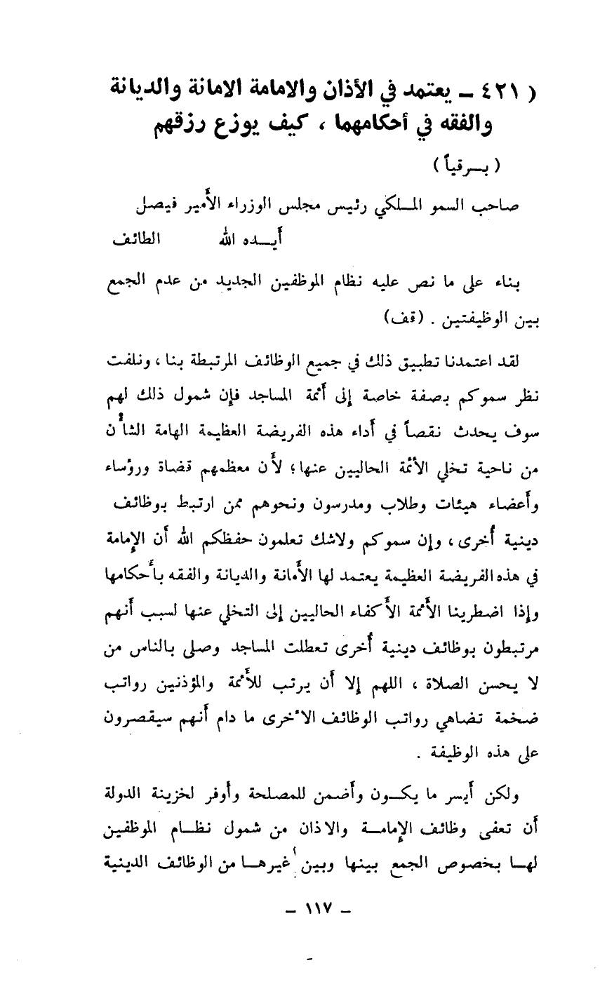 لقد اعتمدنا تطبيق ذلك في جميع الوظائف المرتبطة بنا، ونلفت نظر سموكم بصفة خاصة إِلى أَئمة المساجد فإِن شمول ذلك لهم سوف يحدث نقصًا في أَداء هذه الفريضة العظيمة الهامة الشأْن من ناحية تخلي الأَئمة الحاليين عنها؛ لأَن معظمهم قضاة ورؤساء وأَعضاء هيئات وطلاب ومدرسون ونحوهم ممن ارتبط بوظائف دينية أُخرى، وإِن سموكم ولا شك تعلمون حفظكم الله أَن الإِمامة في هذه الفريضة العظيمة يعتمد لها الأَمانة والديانة والفقه بأَحكامها وإِذا اضطرينا الأَئمة الأَكفاء الحاليين إِلى التخلي عنها لسبب أَنهم مرتبطون بوظائف دينية أخرى تعطلت المساجد وصلى بالناس من لا يحسن الصلاة، اللهم إِلا أَن يرتب للأَئمة والمؤذنين رواتب ضخمة تضاهي رواتب الوظائف الأخرى ما دام أَنهم سيقصرون على هذه الوظيفة.