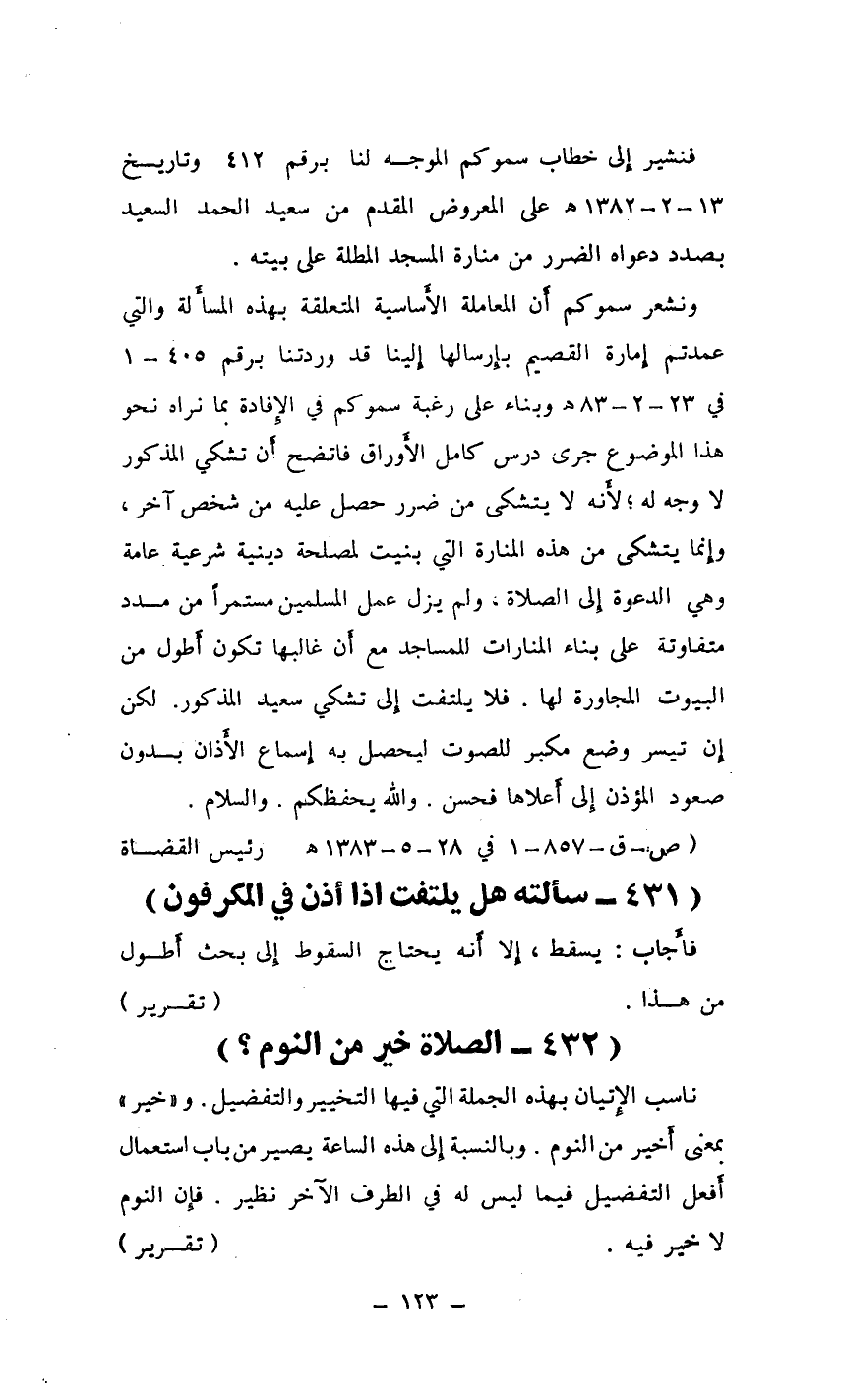 ونشعر سموكم أَن المعاملة الأَساسية المتعلقة بهذه المسأَلة والتي عمدتم إِمارة القصيم بإِرسالها إِلينا قد وردتنا برقم 405-1 في 23-2-83 هـ وبناء على رغبة سموكم في الإِفادة بما نراه نحو هذا الموضوع جرى درس كامل الأَوراق فاتضح أَن تشكي المذكور لا وجه له؛ لأَنه لا يتشكى من ضرر حصل عليه من شخص آخر، وإِنما يتشكى من هذه المنارة التي بنيت لمصلحة دينية شرعية عامة وهي الدعوة إِلى الصلاة، ولم يزل عمل المسلمين مستمرًا من مدد متفاوتة على بناء المنارات للمساجد مع أَن غالبها تكون أَطول من البيوت المجاورة لها. فلا يلتفت إِلى تشكي سعيد المذكور. لكن إِن تيسر وضع مكبر للصوت ليحصل به إِسماع الأَذان بدون صعود المؤذن إِلى أَعلاها فحسن. والله يحفظكم. والسلام.