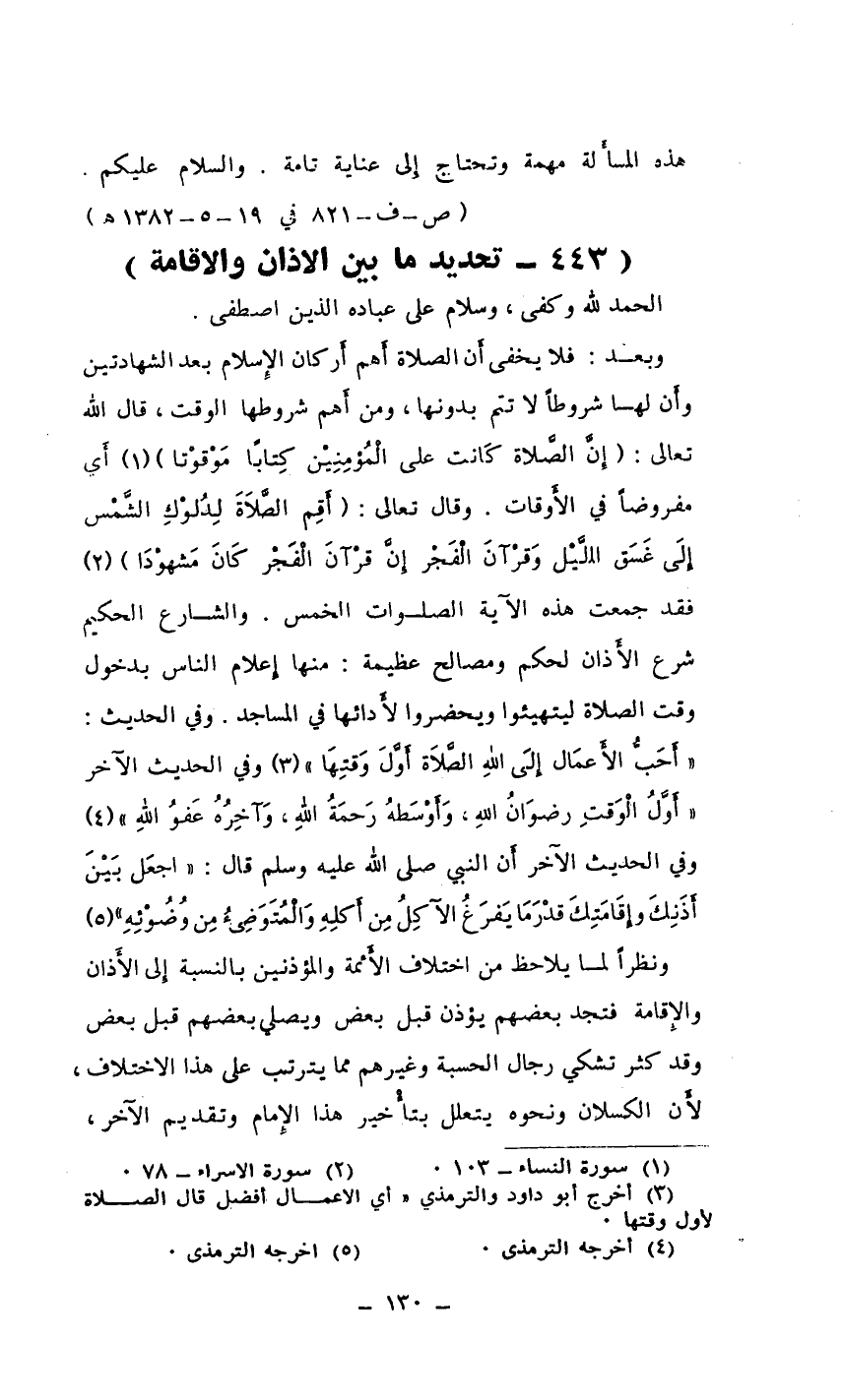 وبعد: فلا يخفى أَن الصلاة أَهم أَركان الإِسلام بعد الشهادتين وأَن لها شروطًا لا تتم بدونها، ومن أَهم شروطها الوقت، قال الله تعالى: (*) (¬1) أي مفروضًا في الأَوقات. وقال تعالى: (*) (¬2) فقد جمعت هذه الآية الصلوات الخمس. والشارع الحكيم شرع الأَذان لحكم ومصالح عظيمة: منها إِعلام الناس بدخول وقت الصلاة ليتهيئوا ويحضروا لأَدائها في المساجد. وفي الحديث: ((أَحَبُّ الأَعمَال إِلَى اللهِ الصَّلاَة أَوَّلَ وَقتِهَا)) (¬3) وفي الحديث الآخر ((أَوَّلَ الْوَقتِ رضوَانُ اللهِ، وَأَوْسَطهُ رَحمَةُ اللهِ، وَآخِرُهُ عَفوُ اللهِ)) وفي الحديث الآخر أَن النبي صلى الله عليه وسلم قال: ((اجعَل بَيْنَ أَذَنِكَ وإِقَامَتِكَ قدْرَ مَا يَفرَغُ الآكِلُ مِن أَكلِهِ وَالْمُتَوَضِىءُ مِن وُضُوْئِهِ)) (¬4) .
