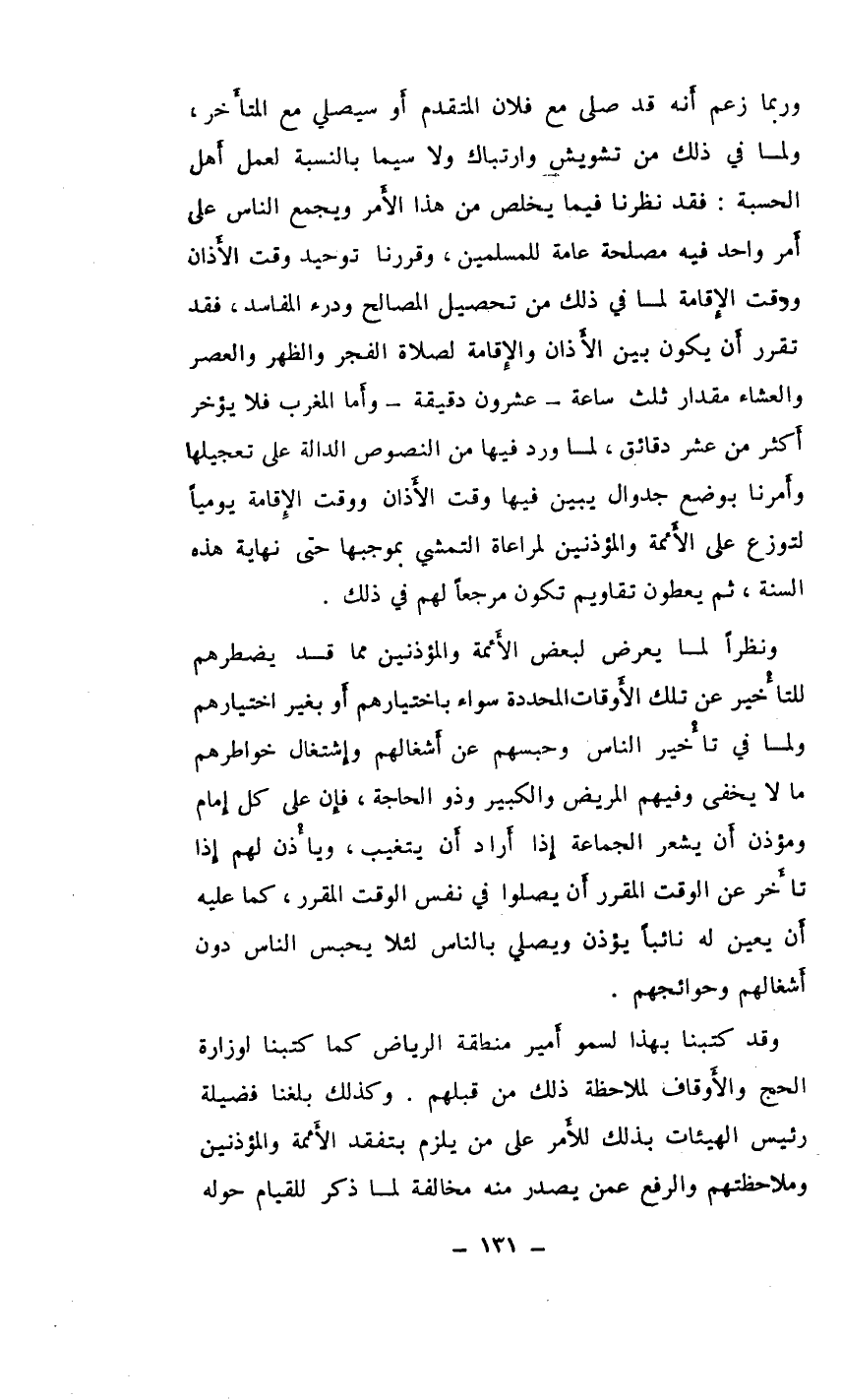 وربما زعم أَنه قد صلى مع فلان المتقدم أَو سيصلي مع المتأَخر، ولما في ذلك من تشويش وارتباك ولا سيما بالنسبة لعمل أَهل الحسبة: فقد نظرنا فيما يخلص من هذا الأمر ويجمع الناس على أَمر واحد فيه مصلحة عامة للمسلمين، وقررنا توحيد وقت الأَذان ووقت الإِقامة لما في ذلك من تحصيل المصالح ودرء المفاسد، فقد تقرر أَن يكون بين الأَذان والإِقامة لصلاة الفجر والظهر والعصر والعشاء مقدار ثلث ساعة - عشرون دقيقة - وأما المغرب فلا يؤخر أَكثر من عشر دقائق، لما ورد فيها من النصوص الدالة على تعجيلها وأَمرنا بوضع جدوال يبين فيها وقت الأَذان ووقت الإِقامة يوميًا لتوزع على الأَئمة والمؤذنين لمراعاة التمشي بموجبها حتى نهاية هذه السنة، ثم يعطون تقاويم تكون مرجعًا لهم في ذلك.