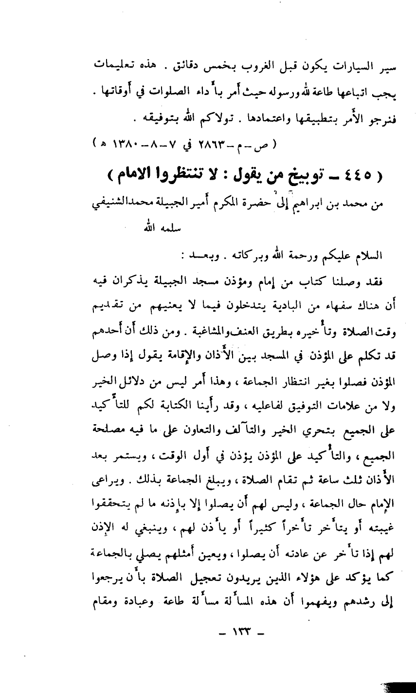 فقد وصلنا كتاب من إِمام ومؤذن مسجد الجبيلة يذكران فيه أَن هناك سفهاء من البادية يتدخلون فيما لا يعنيهم من تقديم وقت الصلاة وتأْخيره بطريق العنف والمشاغبة. ومن ذلك أَن أَحدهم قد تكلم على المؤذن في المسجد بين الأَذان والإِقامة يقول إِذا وصل المؤذن فصلوا بغير انتظار الجماعة، وهذا أَمر ليس من دلائل الخير ولا من علامات التوفيق لفاعليه، وقد رأَينا الكتابة لكم للتأْكيد على الجميع بتحري الخير والتآلف والتعاون على ما فيه مصلحة الجميع، والتأْكيد على المؤذن يؤذن في أَول الوقت، ويستمر بعد الأَذان ثلث ساعة ثم تقام الصلاة، ويبلغ الجماعة بذلك. ويراعى الإِمام حال الجماعة، وليس لهم أَن يصلوا إِلا بإِذنه ما لم يتحققوا غيبته أَو يتأَخر تأَخرًا كثيرًا أَو يأْذن لهم، وينبغي له الإِذن لهم إِذا تأَخر عن عادته أَن يصلوا. ويعين أَمثلهم يصلي بالجماعة كما يؤكد على هؤلاء الذين يريدون تعجيل الصلاة بأَن يرجعوا إِلى رشدهم ويفهموا أَن هذه المسأَلة مسأَلة طاعة وعبادة ومقام