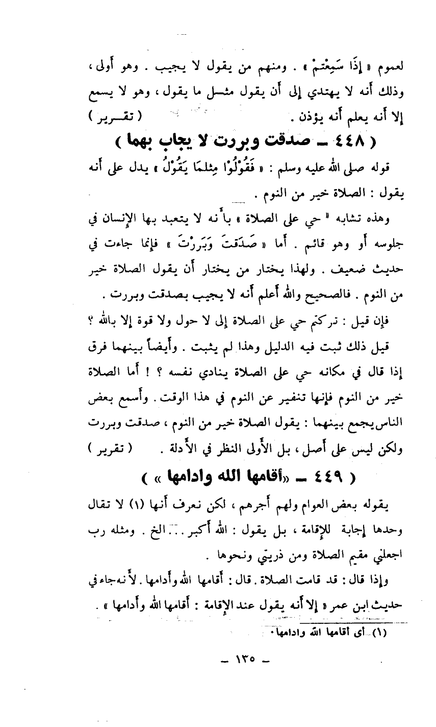 وهذه تشابه ((حي على الصلاة)) بأَنه لا يتعبد بها الإِنسان في جلوسه أَو وهو قائم. أَما ((صَدَقتَ وَبَررْتَ)) فإِنما جاءت في حديث ضعيف. ولهذا يختار من يختار أن يقول الصلاة خير من النوم. فالصحيح والله أَعلم أَنه لا يجيب بصدقت وبررت.
