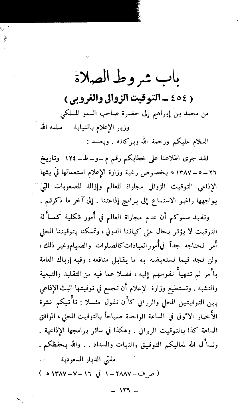 فقد جرى اطلاعنا على خطابكم رقم م-و-ط-124 وتاريخ 26-5-1387 هـ بخصوص رغبة وزارة الإِعلام استعمالها في بثها الإِذاعي التوقيت الزوالي مجاراة للعالم وإِزالة للصعوبات التي يواجهها راغبو الاستماع إِلى برامج إِذاعتنا. إِلى آخر ما ذكرتم.