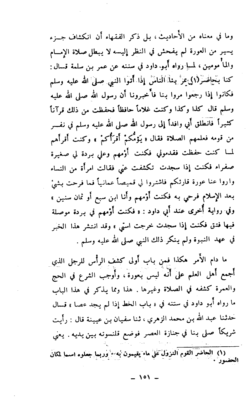 وما في معناه من الأَحاديث، بل ذكر الفقهاء أَن انكشاف جزء يسير من العورة لم يفحش في النظر إِليه لا يبطل صلاة الإِمام والمأْمومين، لما رواه أَبو داود في سننه عن عمر بن سلمة قال: كنا بحاضر (¬1) يمر بنا الناس إِذا أَتوا النبي صلى الله عليه وسلم فكانوا إِذا رجعوا مروا بنا فأَخبرونا أَن رسول الله صلى الله عليه وسلم قال كذا وكذا وكنت غلامًا حافظًا فحفظت من ذلك قرآنًا كثيرًا فانطلق أَبي وافدًا إِلى رسول الله صلى الله عليه وسلم في نفر من قومه فعلمهم الصلاة فقال ((يَؤمُّكمنْ أَقرَأَكمْ)) وكنت أَقرأهم لما كنت حفظت فقدموني فكنت أَؤمهم وعلي بردة لي صغيرة صفراء فكنت إِذا سجدت تكشفت عني فقالت امرأَة من النساء واروا عنا عورة قارئكم فاشتروا لي قميصًا عمانيًا فما فرحت بشيء بعد الإِسلام فرحي به فكنت أَؤمهم وأَنا ابن سبع أَو ثمان سنين)) وفي رواية أُخرى عند أَبي داود: ((فكنت أَؤمهم في بردة موصلة فيها فتق فكنت إِذا سجدت خرجت استي)) وقد انتشر هذا الخبر في عهد النبوة لوم ينكر ذلك النبي صلى الله عليه وسلم.