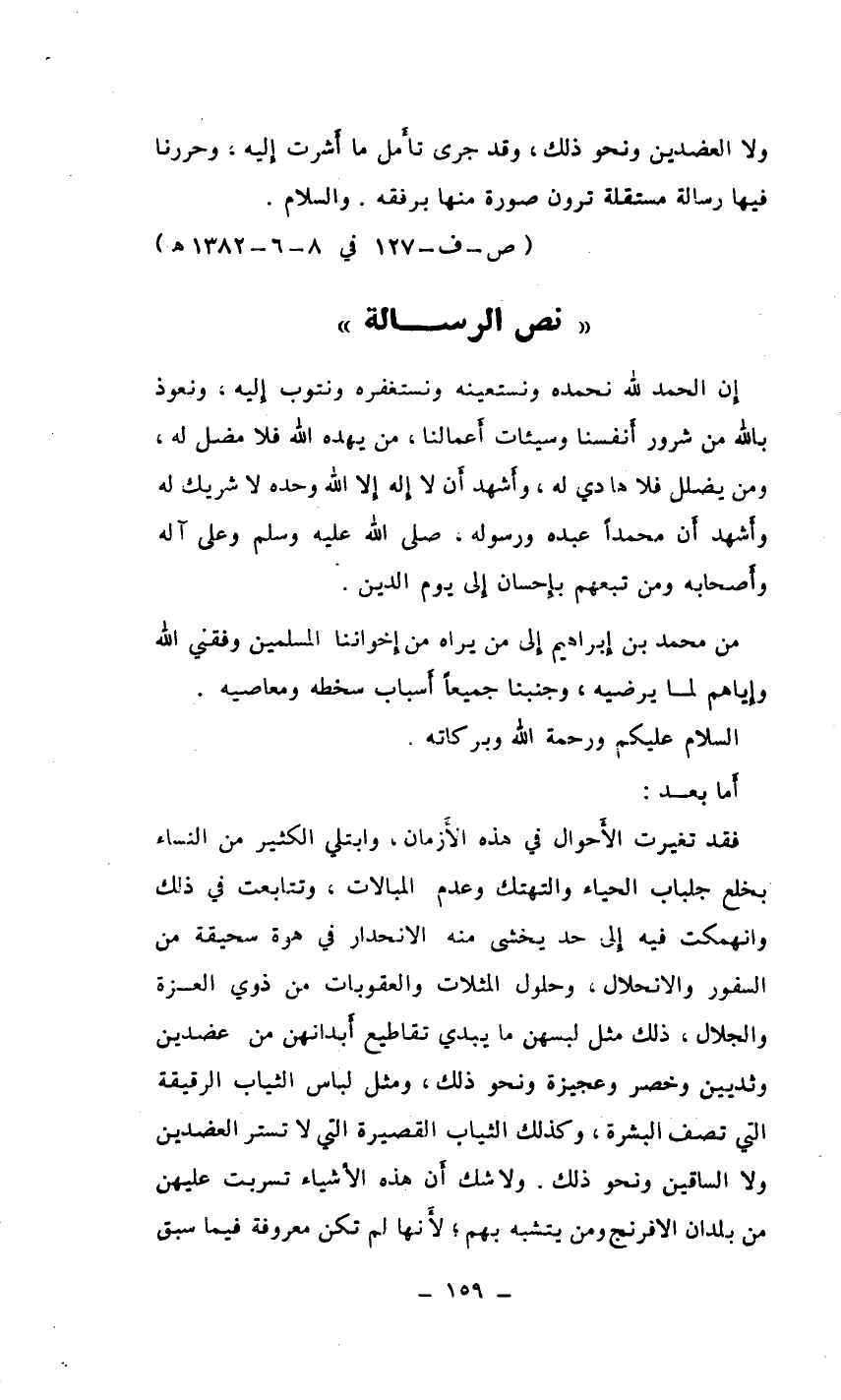 فقد تغيرت الأَحوال في هذه الأَزمان، وابتلي الكثير من النساء بخلع جلباب الحياء والتهتك وعدم المبالات، وتتابعت في ذلك وانهمكت فيه إِلى حد يخشى منه الانحدار في هوة سحيقة من السفور والانحلال، وحلول المثلات والعقوبات من ذي العزة والجلال، ذلك مثل لبسهن ما يبدي تقاطيع أَبدانهن من عضدين وثديين وخصر وعجيزة ونحو ذلك، ومثل لباس الثياب الرقيقة التي تصف البشرة، وكذلك الثياب القصيرة التي لا تستر العضدين ولا الساقين ونحو ذلك. ولا شك أَن هذه الأَشياء تسربت عليهن من بلدان الأفرنج ومن يتشبه بهم، لأَنها لم تكن معروفة فيما سبق