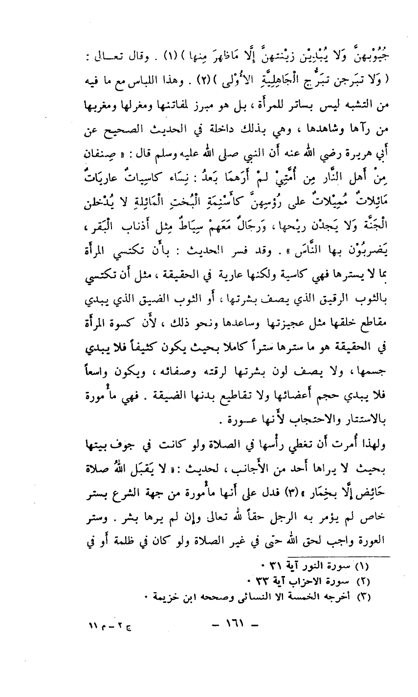 وهذا اللباس مع ما فيه من التشبه ليس بساتر للمرأَة، بل هو مبرز لمفاتنها ومغرلها ومغربها من رآها وشاهدها، وهي بذلك داخلة في الحديث الصحيح عن أَبي هريرة رضي الله عنه أَن النبي صلى الله عليه وسلم قال: ((صِنفان مِنْ أَهل النَّار مِن أُمَّتِيْ لمْ أَرَهمَا بَعدُ: نِسَاء كاسِياتٌ عاريَاتٌ مَائِلاتٌ مُمِيْلاتٌ على رُؤسِهنَّ كأَسْنِمَةِ الْبُختِ الْمَائِلةِ لا يدْخلن الْجَنَّة وَلا يَجدْن ريْحها، وَرجَالٌ مَعَهمْ سِيَاطٌ مِثل أَذناب الْبَقر، يَضربُوْن بها النَّاسَ)) . وقد فسر الحديث: بأَن تكتسي المرأَة بما لا يسترها فهي كاسية ولكنها عارية في الحقيقة، مثل أَن تكتسي بالثوب الرقيق الذي يصف بشرتها، أَو الثوب الضيق الذي يبدي مقاطع خلقها مثل عجيزتها وساعدها ونحو ذلك، لأَن كسوة المرأَة في الحقيقة هو ما سترها سترًا كاملا بحيث يكون كثيفًا فلا يبدي جسمها، ولا يصف لون بشرتها لرقته وصفائه، ويكون واسعًا فلا يبدي حجم أَعضائها ولا تقاطيع بدنها الضيقة. فهي مأْمورة بالاستتار والاحتجاب لأَنها عورة.
