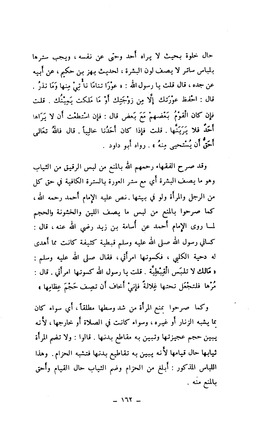 وقد صرح الفقهاء رحمهم الله بالمنع من لبس الرقيق من الثياب وهو ما يصف البشرة أَي مع ستر العورة بالسترة الكافية في حق كل من الرجل والمرأة ولو في بيتها. نص عليه الإِمام أَحمد رحمه الله، كما صرحوا بالمنع من لبس ما يصف اللين والخشونة والحجم لما روى الإِمام أَحمد عن أُسامة بن زيد رضي الله عنه، قال: كساني رسول الله صلى الله عليه وسلم قبطية كثيفة كانت مما أَهدى له دحية الكلبي، فكسوتها امرأَتي، فقال صلى الله عليه وسلم: ((مَالك لا تلبَس الْقِبْطِيَّة. قلت يا رسول الله كسوتها امرأَتي. قال: مُرْها فلتجْعَل تحتها غِلالةً فإِنيْ أَخاف أَن تصِف حَجْمَ عِظامِها)) .