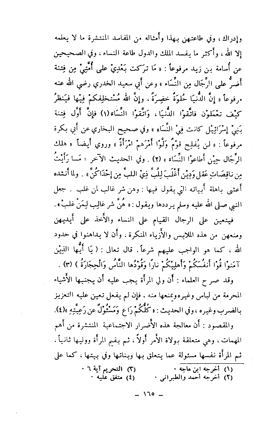 والمقصود: أَن معالجة هذه الأَضرار الاجتماعية المنتشرة من أَهم المهمات. وهي متعلقة بولاة الأَمر أَولاً. ثم بقيِّم المرأَة ووليها ثانيًا. ثم المرأَة نفسها مسئولة عما يتعلق بها وبناتها وفي بيتها، كما على