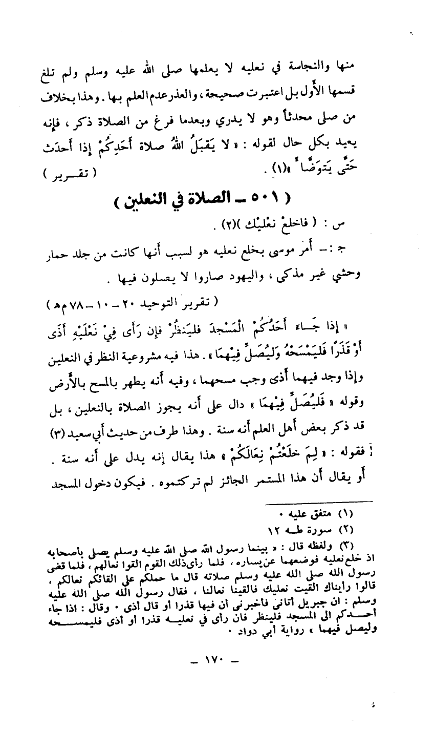 (¬3) ولفظه قال: ((بينما رسول الله صلى الله عليه وسلم يصلي بأَصحابه اذ خلع نعليه فوضعهما عن يساره، فلما رأى ذلك القوم القوا نعالهم، فلما قضى رسول الله صلى الله عليه وسلم صلاته قال ما حملكم على القائكم نعالكم، قالوا رأيناك القيت نعليك فألقينا نعالنا، فقال رسول الله صلى الله عليه وسلم: إن جبريل أتاني فأخبرني أن فيها قذرا أو قال أذى. وقال: إذا جاء أحدكم إِلى المسجد فلينظر فإن رأى في نعليه قذرا أو أذى فليمسحه وليصل فيهما، رواية أبي داود.