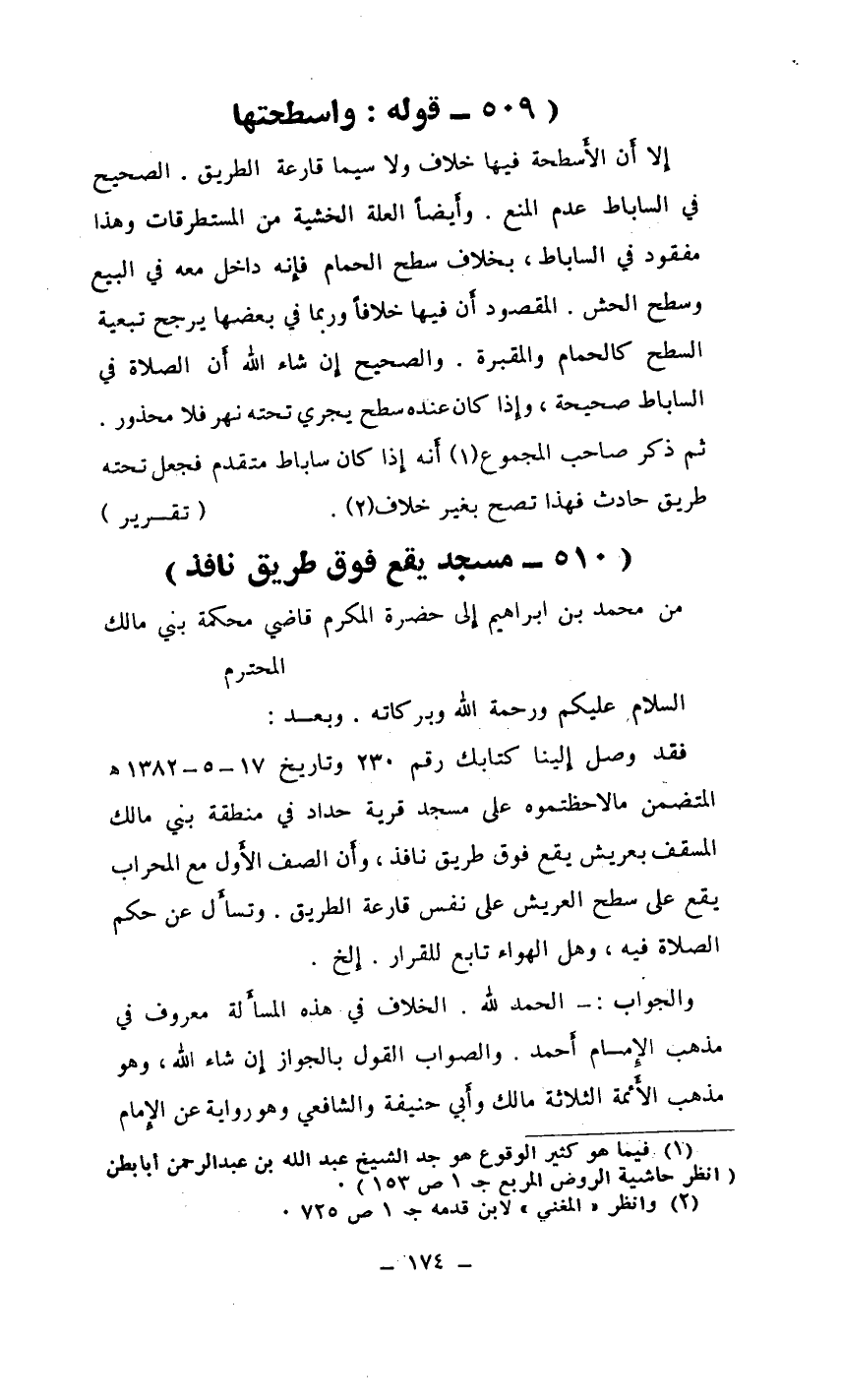 فقد وصل إِلينا كتابك رقم 230 وتاريخ 17-5-1382 هـ المتضمن ما لاحظتموه على مسجد قرية حداد في منطقة بني مالك المسقف بعريش يقع فوق طريق نافذ، وأَن الصف الأَول مع المحراب يقع على سطح العريش على نفس قارعة الطريق. وتسأَل عن حكم الصلاة فيه، وهل الهواء تابع للقرار. إِلخ.