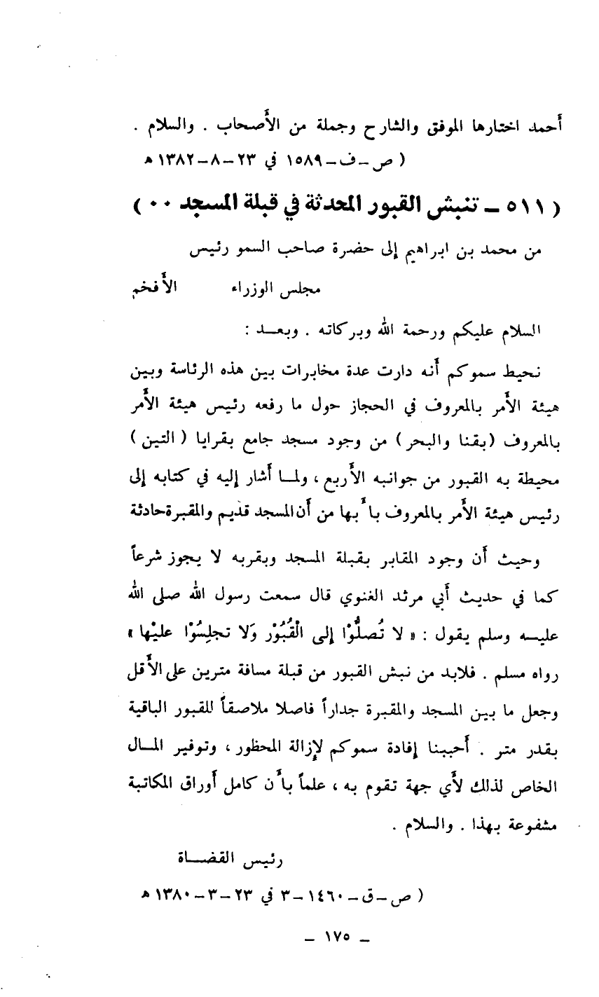وحيث أَن وجود المقابر بقبلة المسجد وبقربه لا يجوز شرعًا كما في حديث أَبي مرثد الغنوي قال سمعت رسول الله صلى الله عليه وسلم يقول: ((لا تُصلُّوْا إِلى الْقُبُوْر وَلا تجلِسُوْا عليْها)) رواه مسلم. فلا بد من نبش القبور من قبلة مسافة مترين على الأَقل وجعل ما بين المسجد والمقبرة جدارًا فاصلاً ملاصقًا للقبور الباقية بقدر متر. أَحببنا إِفادة سموكم لإِزالة المحظور، وتوفير المال الخاص لذلك لأَي جهة تقوم به، علمًا بأَن كامل أَوراق المكاتبة مشفوعة بهذا. والسلام.