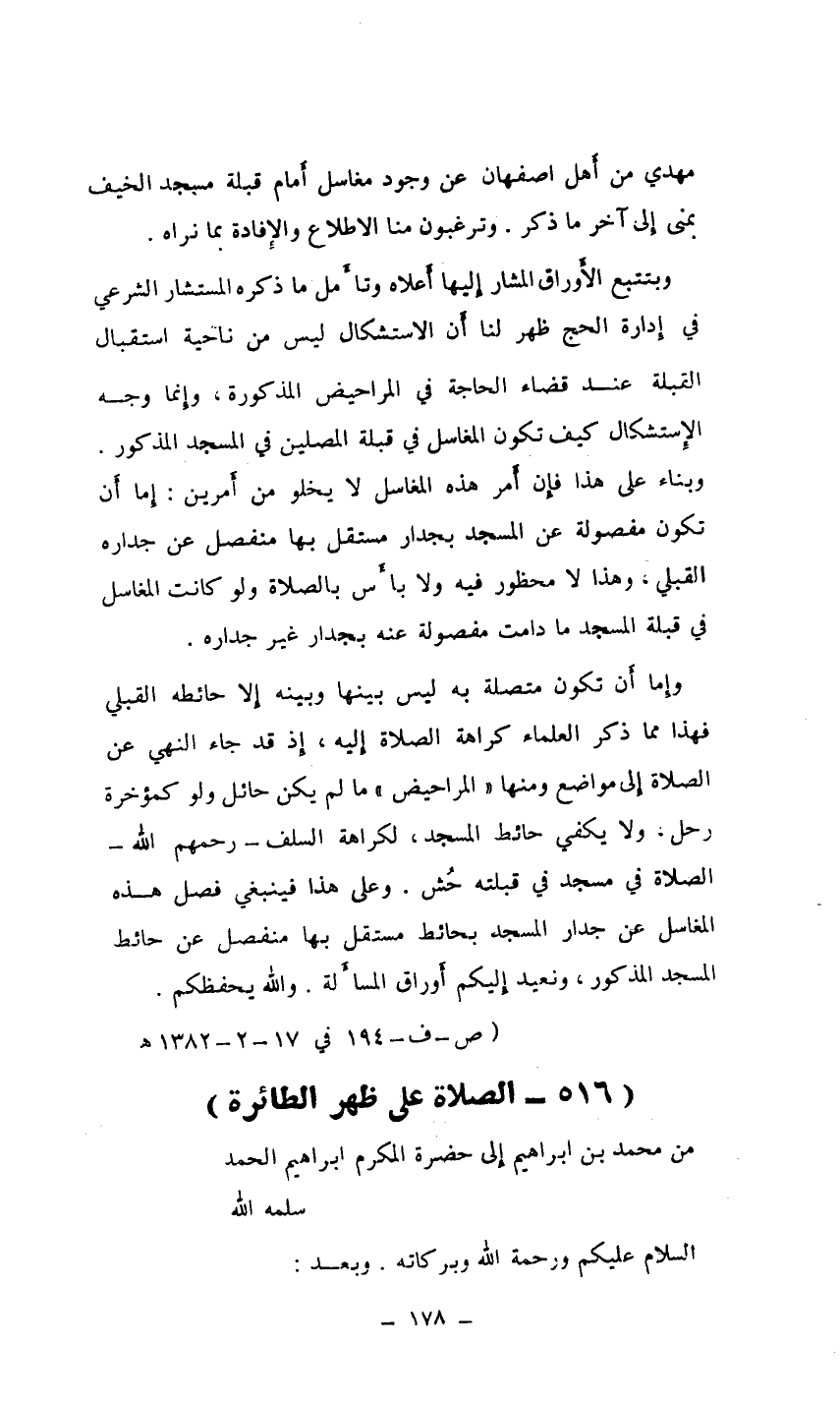 وإِما أَن تكون متصلة به ليس بينها وبينه إِلا حائطه القبلي فهذا مما ذكر العلماء كراهة الصلاة إِليه، إِذ قد جاء النهي عن الصلاة إِلى مواضع ومنها ((المراحيض)) ما لم يكن حائل ولو كمؤخرة رحل، ولا يكفي حائط المسجد، لكراهة السلف -رحمهم الله- الصلاة في مسجد في قبلته حُش. وعلى هذا فينبغي فصل هذه المغاسل عن جدار المسجد بحائط مستقل بها منفصل عن حائط المسجد المذكور، ونعيد إِليكم أَوراق المسأَلة. والله يحفظكم.