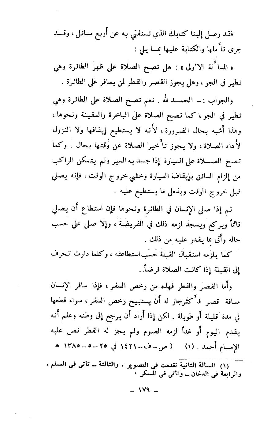 ((المسأَلة الأولى)) : هل تصح الصلاة على ظهر الطائرة وهي تطير في الجو. وهل يجوز القصر والفطر لمن يسافر على الطائرة.