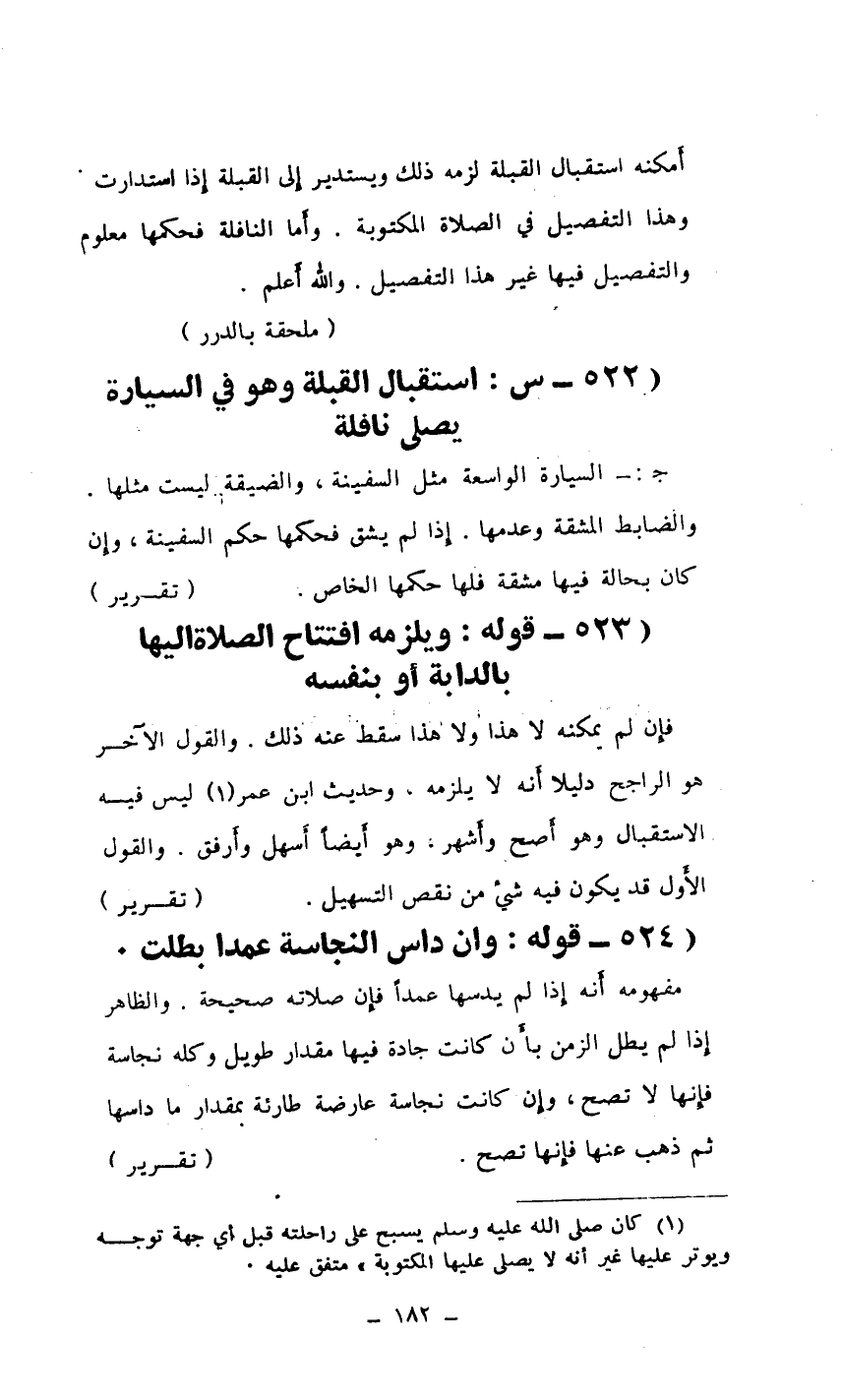 فإِن لم يمكنه لا هذا ولا هذا سقط عنه ذلك. والقول الآخر هو الراجح دليلا أَنه لا يلزمه، وحديث ابن عمر (¬1) ليس فيه الاستقبال وهو أَصح وأَشهر. وهو أَيضًا أَسهل وأَرفق. والقول الأَول قد يكون فيه شيء من نقص التسهيل. ... (تقرير)