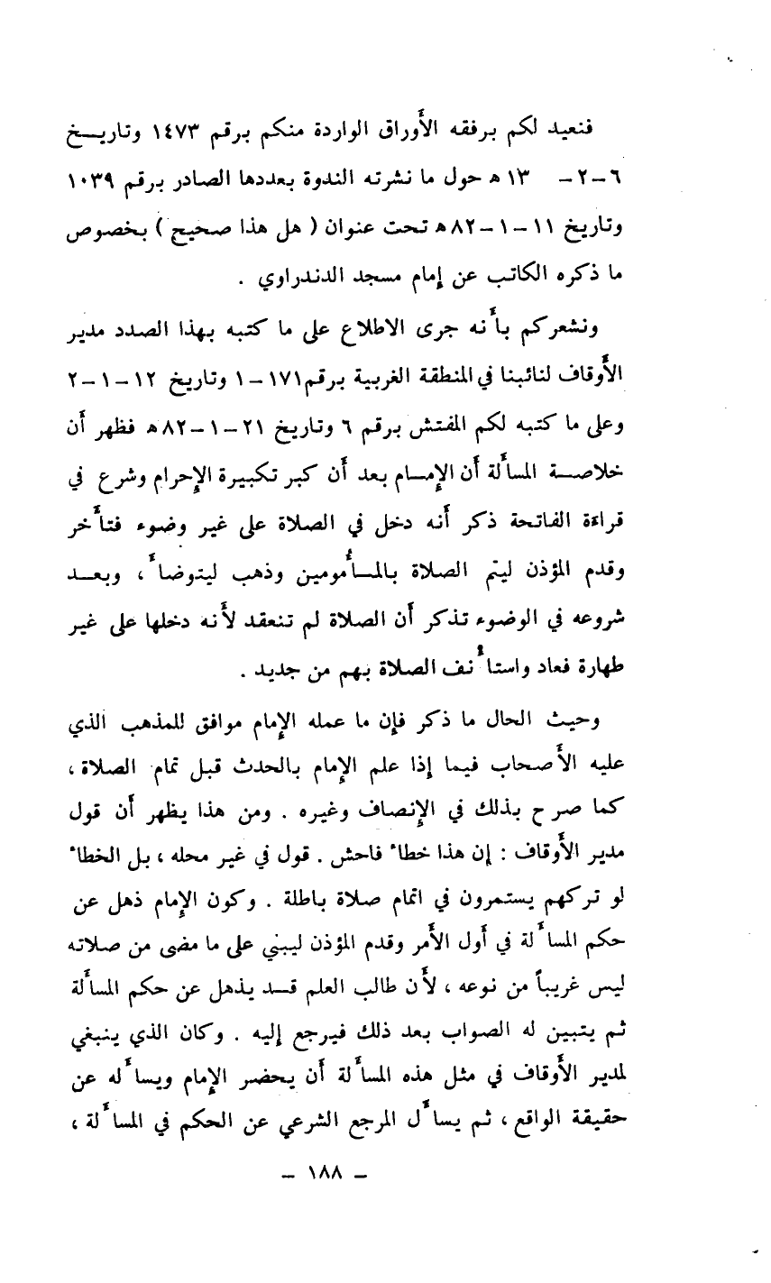 ونشعركم بأَنه جرى الاطلاع على ما كتبه بهذا الصدد مدير الأَوقاف لنائبنا في المنطقة الغربية برقم 171-1 وتاريخ 12-1-2 وعلى ما كتبه لكم المفتش برقم 6 وتاريخ 21-1-82 هـ فظهر أَن خلاصة المسأَلة أَن الإِمام بعد أَن كبر تكبيرة الإِحرام وشرع في قراءَة الفاتحة ذكر أَنه دخل في الصلاة على غير وضوء فتأَخر وقدم المؤذن ليتم الصلاة بالمأْمومين وذهب ليتوضأْ، وبعد شروعه في الوضوء تذكر أَن الصلاة لم تنعقد لأَنه دخلها على غير طهارة فعاد واستأْنف الصلاة بهم من جديد.