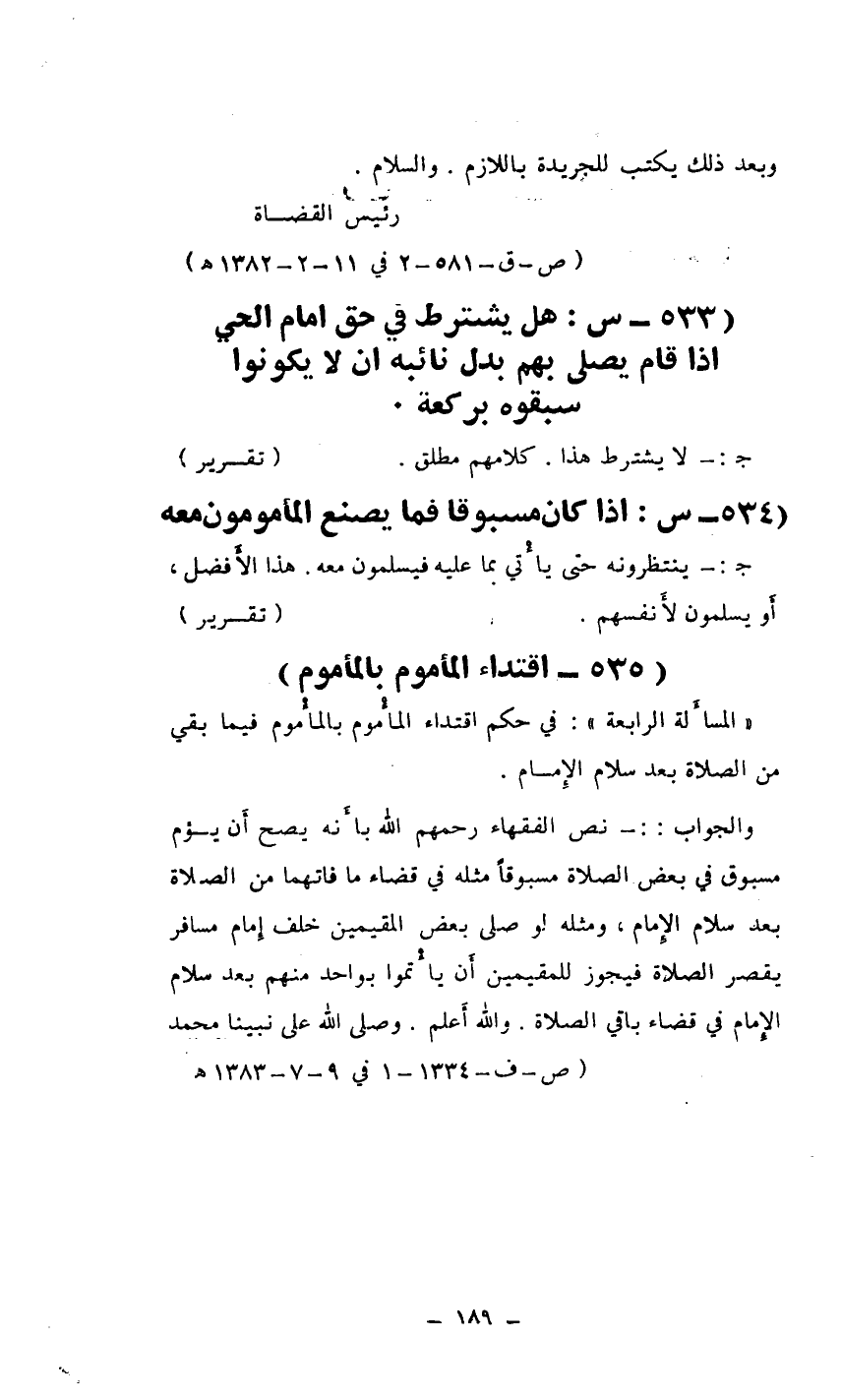 (533- س: هل يشترط في حق امام الحي اذا قام يصلي بهم بدل نائبه ان لا يكونوا سبقوه بركعة.)