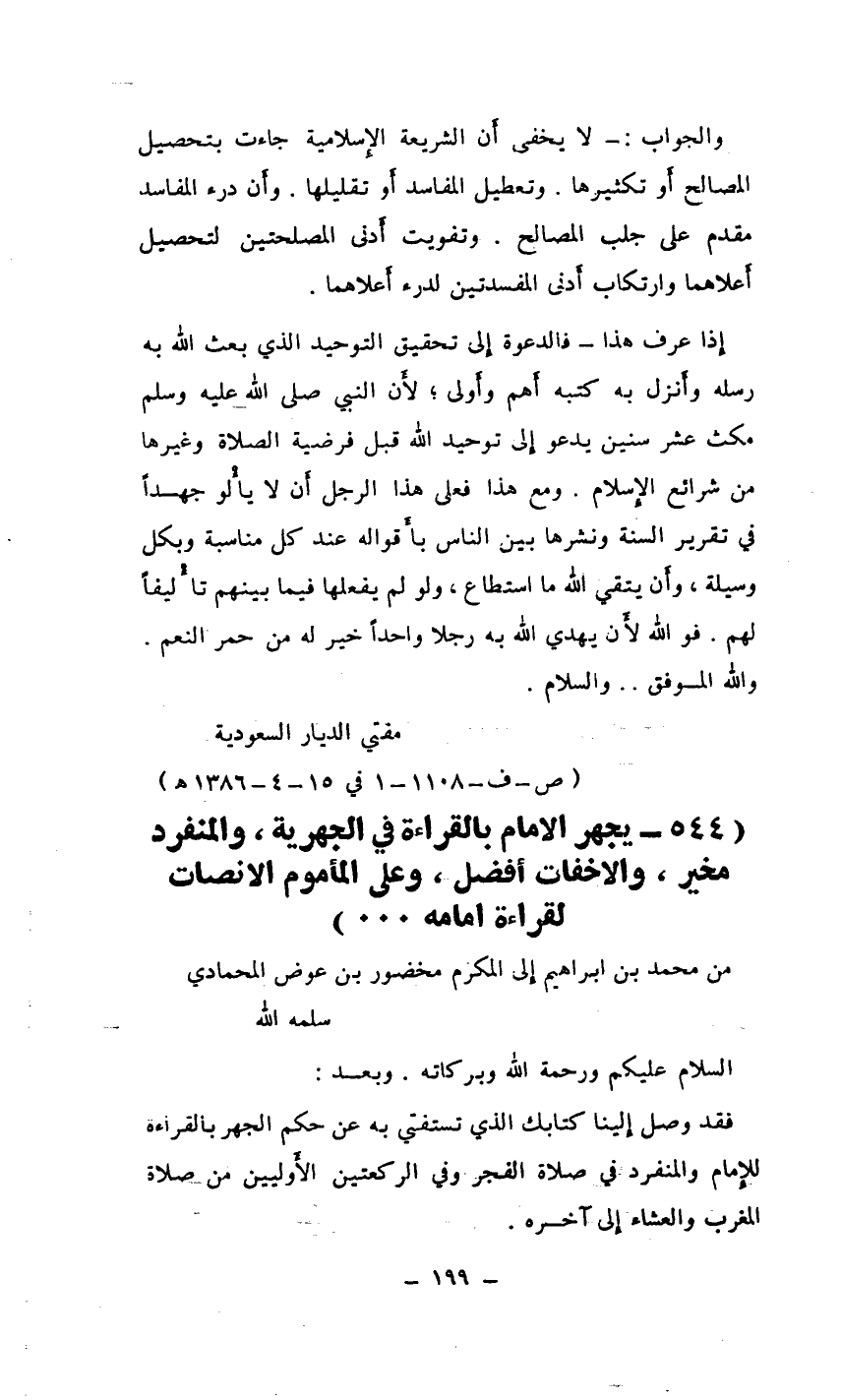 فقد وصل إِلينا كتابك الذي تستفتي به عن حكم الجهر بالقراءة للإِمام والمنفرد في صلاة الفجر وفي الركعتين الأوليين من صلاة المغرب والعشاء إِلى آخره.