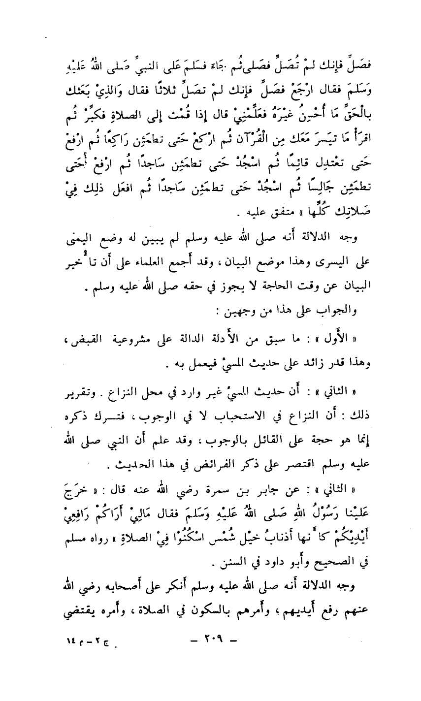 ((الثاني)) : أَن حديث المسيء غير وارد في محل النزاع. وتقرير ذلك: أَن النزاع في الاستحباب لا في الوجوب، فترك ذكره إِنما هو حجة على القائل بالوجوب، وقد علم أَن النبي صلى الله عليه وسلم اقتصر على ذكر الفرائض في هذا الحديث.