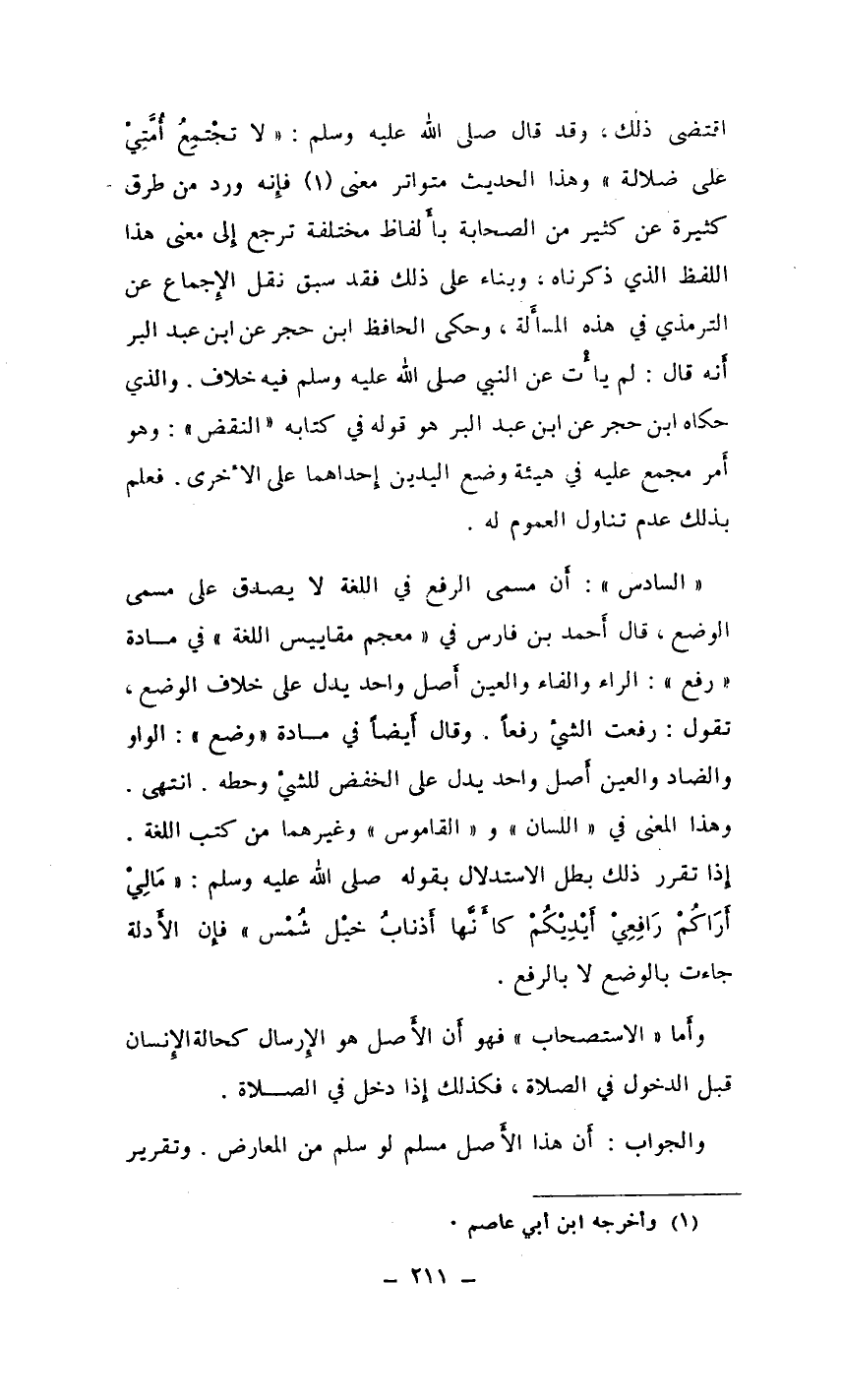 اقتضى ذلك، وقد قال صلى الله عليه وسلم: ((لا تجْتمِعُ أُمَّتيْ على ضلالة)) وهذا الحديث متواتر معنى (¬1) فإِنه ورد من طرق كثيرة عن كثير من الصحابة بأَلفاظ مختلفة ترجع إِلى معنى هذا اللفظ الذي ذكرناه، وبناء على ذلك فقد سبق نقل الإِجماع عن الترمذي في هذه المسأَلة، وحكى الحافظ ابن حجر عن ابن عبد البر أَنه قال: لم يأْت عن النبي صلى الله عليه وسلم فيه خلاف. والذي حكاه ابن حجر عن ابن عبد البر هو قوله في كتابه ((النقض)) : وهو أَمر مجمع عليه في هيئة وضع اليدين إِحداهما على الأخرى. فعلم بذلك عدم تناول العموم له.