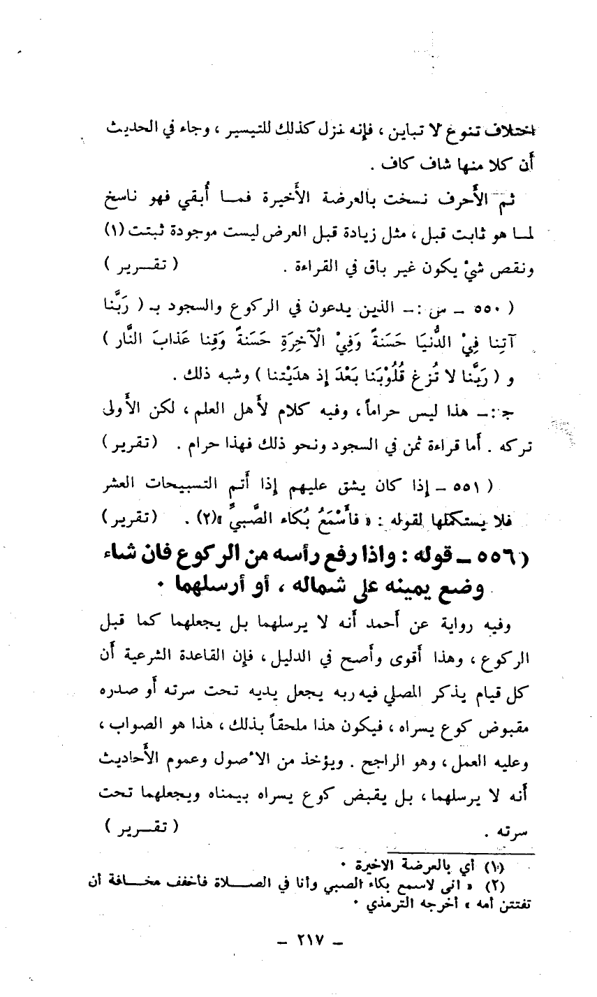 (556- قوله: وإذا رفع رأسه من الركوع فإن شاء وضع يمينه على شماله، أَو أَرسلهما.)