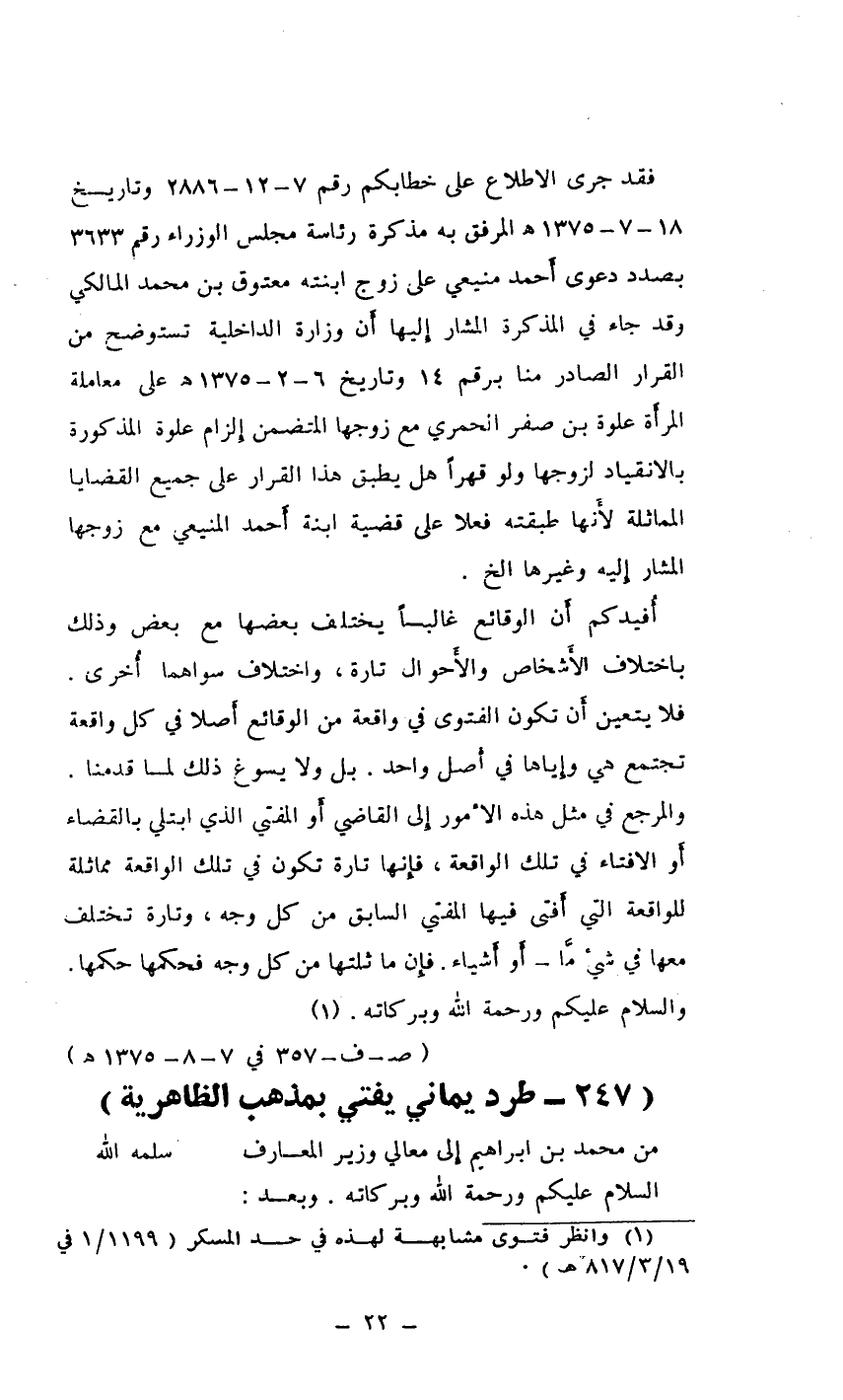 أُفيدكم أَن الوقائع غالبًا يختلف بعضها مع بعض وذلك باختلاف الأَشخاص والأَحوال تارة، واختلاف سواهما أُخرى. فلا يتعين أَن تكون الفتوى في واقعة من الوقائع أًصلا في كل واقعة تجتمع هي وإِياها في أَصل واحد. بل ولا يسوغ ذلك لما قدمنا. والمرجع في مثل هذه الأمور إِلى القاضي أَو المفتي الذي ابتلي بالقضاء أَو الافتاء في تلك الواقعة، فإِنها تارة تكون في تلك الواقعة مماثلة للواقعة التي أَفتى فيها المفتي السابق من كل وجه، وتارة تختلف معها في شيء مَّا - أَو أَشياء. فإِن ما ثلتها من كل وجه فحكمها حكمها. والسلام عليكم ورحمة الله وبركاته. (¬1)