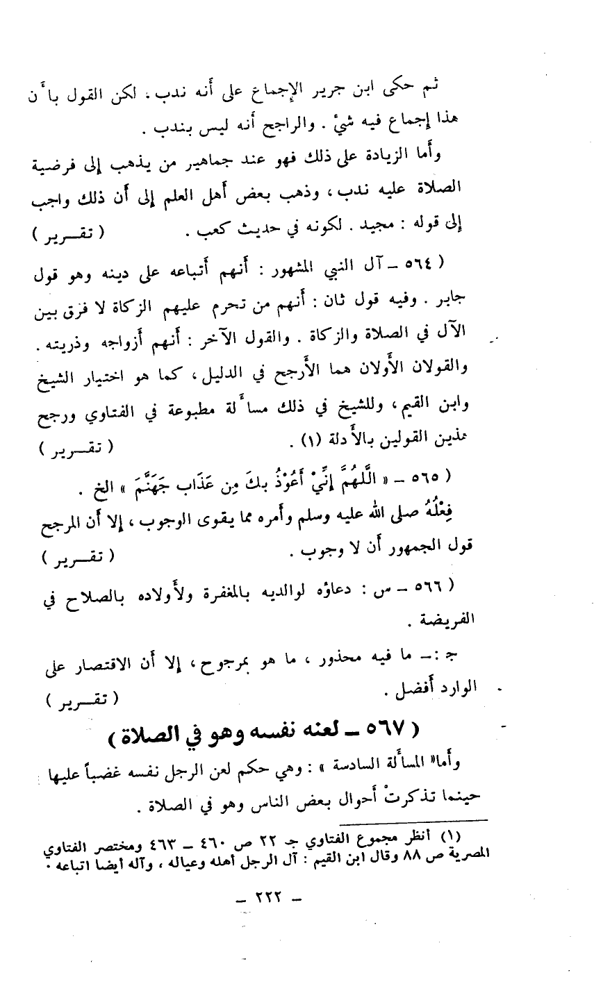 (564- آل النبي المشهور: أَنهم أَتباعه على دينه وهو قول جابر. وفيه قول ثان: أَنهم من تحرم عليهم الزكاة لا فرق بين الآل في الصلاة والزكاة. والقول الآخر: أَنهم أَزواجه وذريته. والقولان الأَولان هما الأَرجح في الدليل، كما هو اختيار الشيخ وابن القيم، وللشيخ في ذلك مسأَلة مطبوعة في الفتاوي ورجح هذين القولين بالأَدلة (¬1) . ... (تقرير)