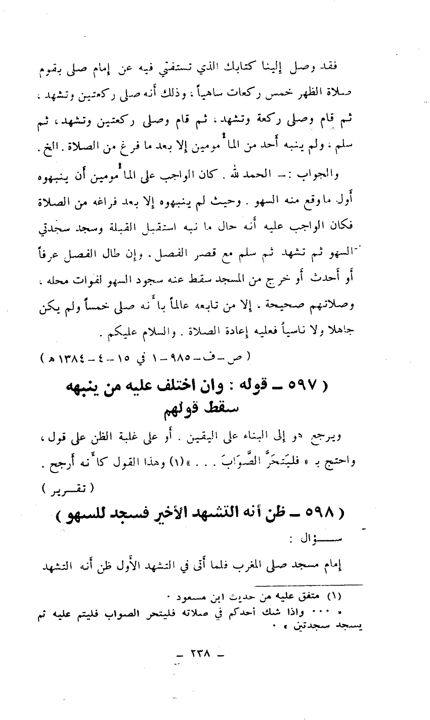 فقد وصل إِلينا كتابك الذي تستفتي فيه عن إِمام صلى بقوم صلاة الظهر خمس ركعات ساهيًا، وذلك أَنه صلى ركعتين وتشهد، ثم قام وصلى ركعة وتشهد، ثم قام وصلى ركعتين وتشهد، ثم سلم، ولم ينبه أَحد من المأْمومين إِلا بعد ما فرغ من الصلاة. الخ.
