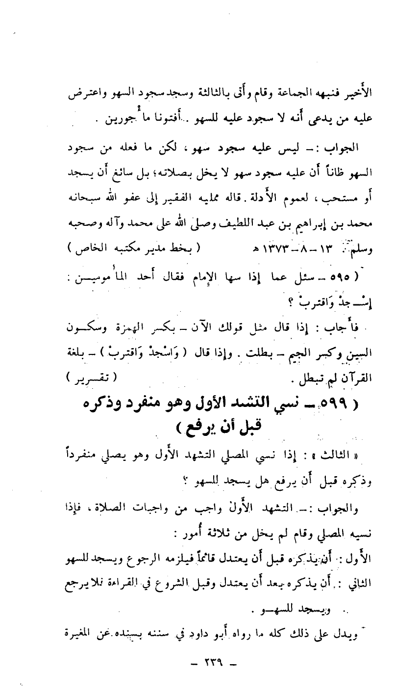 الجواب: - ليس عليه سجود سهو، لكن ما فعله من سجود السهو ظانًا أَن عليه سجود سهو لا يخل بصلاته؛ بل سائغ أَن يسجد أَو مستحب، لعموم الأَدلة. قال ممليه الفقير إِلى عفو الله سبحانه محمد بن إبراهيم بن عبد اللطيف وصلى الله على محمد وآله وصحبه وسلم. 13-8-1373 هـ ... (بخط مدير مكتبه الخاص)