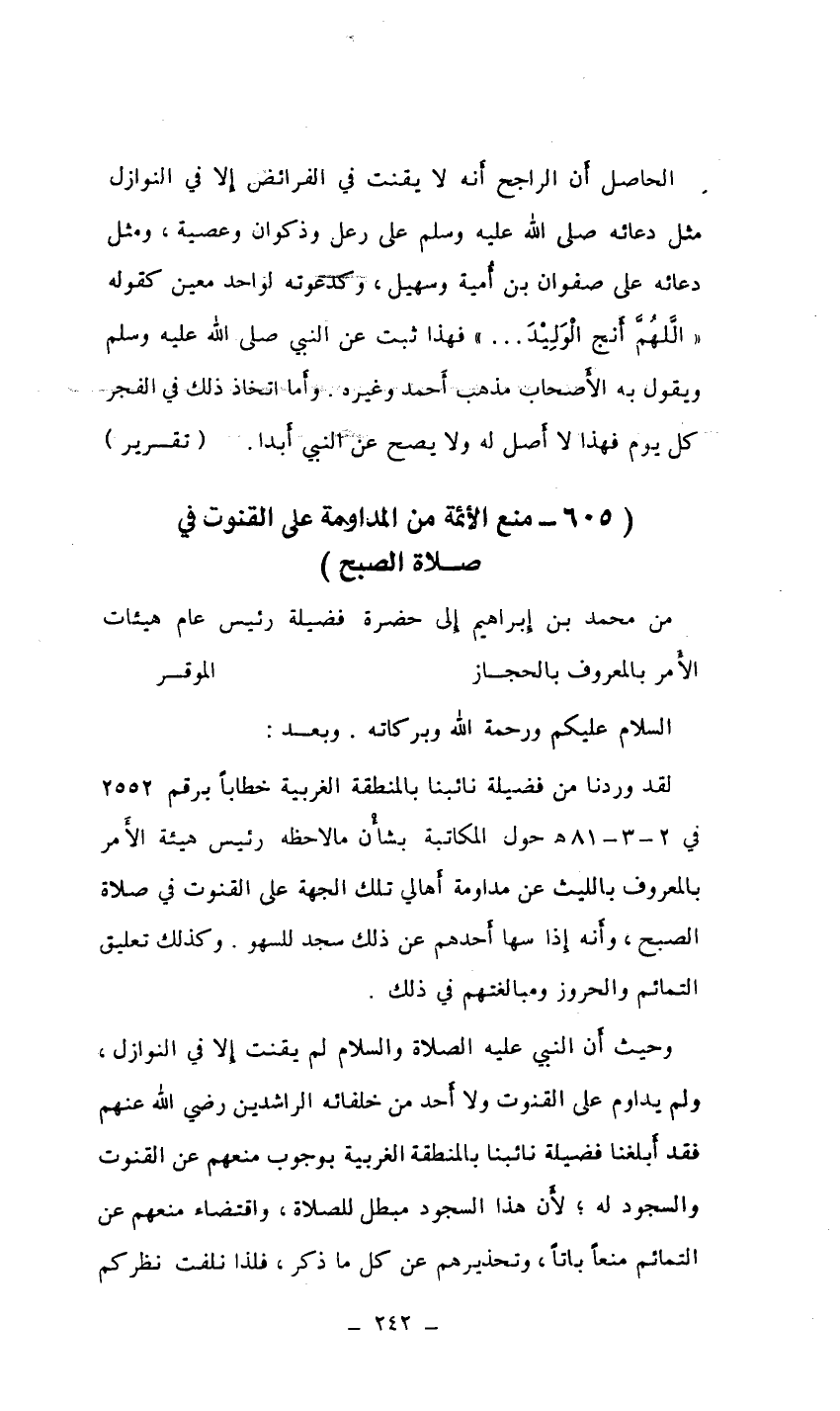 وحيث أَن النبي عليه الصلاة والسلام لم يقنت إِلا في النوازل، ولم يداوم على القنوت ولا أَحد من خلفائه الراشدين رضي الله عنهم فقد أَبلغنا فضيلة نائبنا بالمنطقة الغربية بوجوب منعهم عن القنوت والسجود له؛ لأَن هذا السجود مبطل للصلاة، واقتضاء منعهم عن التمائم منعًا باتًا، وتحذيرهم عن كل ما ذكر، فلذا نلفت نظركم