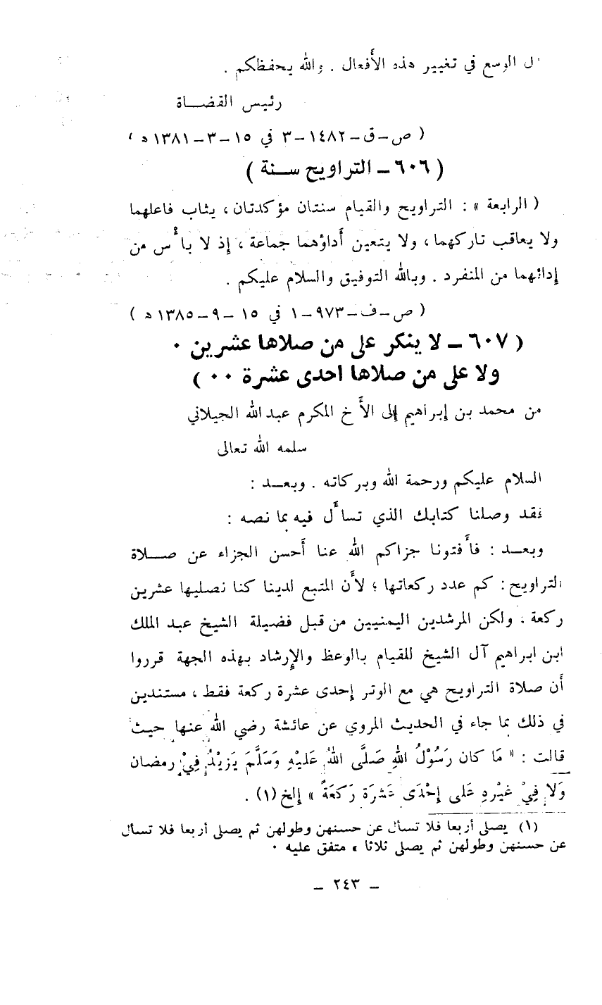 وبعد: فأَفتونا جزاكم الله عنا أَحسن الجزاء عن صلاة التراويح: كم عدد ركعاتها؛ لأَن المتبع لدينا كنا نصليها عشرين ركعة، ولكن المرشدين اليمنيين من قبل فضيلة الشيخ عبد الملك ابن إبراهيم آل الشيخ للقيام بالوعظ والإِرشاد بهذه الجهة قرروا أَن صلاة التراويح هي مع الوتر إِحدى عشرة ركعة فقط، مستندين في ذلك بما جاء في الحديث المروي عن عائشة رضي الله عنها حيث قالت: ((مَا كان رَسُوْلُ اللهِ صَلَّى اللهُ عَليْهِ وَسَلَّمَ يَزيْدُ فِيْ رمضان وَلا فِيْ غيْرهِ عَلى إِحْدَى عَشرَة رَكعَةً)) إِلخ (¬1) .