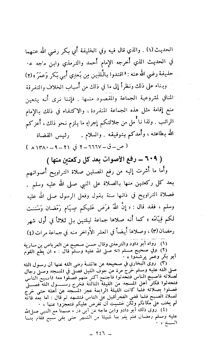 وبناء على ذلك ونظرًا إِلى ما في ذلك من أَسباب الخلاف والتفرقة المنافي لمشروعية الجماعة والمقصود منها. فإِننا نرى أَنه يتعين منع إِقامة مثل هذه الجماعة المنفردة، والاكتفاء في ذلك بالإِمام الراتب. ولذا نأْمل من جلالتكم إِجراء ما يلزم نحو ذلك، أَعزكم الله بطاعته، وأَمدكم بتوفيقه. والسلام. ... رئيس القضاة