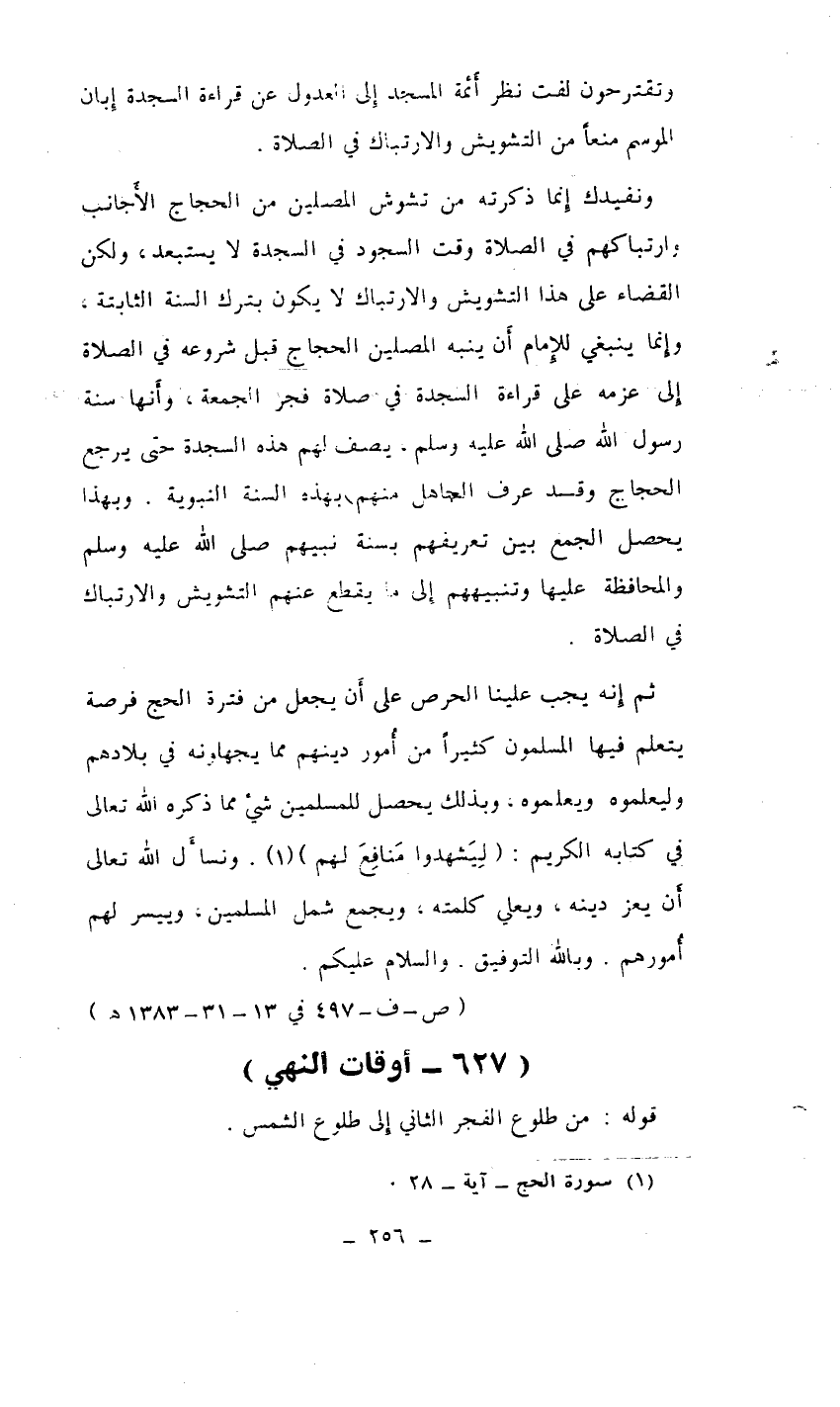 ونفيدك إنما ذكرته من تشوش المصلين من الحجاج الأجانب وارتباكهم في الصلاة وقت السجود في السجدة لا يستبعد، ولكن القضاء على هذا التشويش والارتباك لا يكون بترك السنة الثابتة، وإنما ينبغي للإمام أن ينبه المصلين الحجاج قبل شروعه في الصلاة إلى عزمه على قراءة السجدة في صلاة فجر الجمعة، وأنها سنة رسول الله صلى الله عليه وسلم، يصف لهم هذه السجدة حتى يرجه الحجاج وقد عرف الجاهل منهم بهذه السنة النبوية. وبهذا يحصل الجمع بين تعريفهم بسنة نبيهم صلى الله عليه وسلم والمحافظة عليها وتنبيههم إلى ما يقطع عنهم التشويش والارتباك في الصلاة.