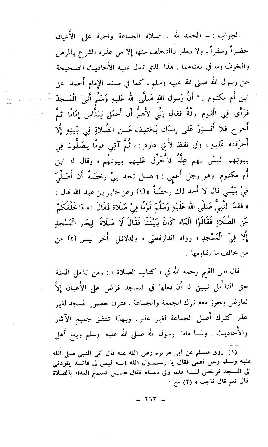 قال ابن القيم رحمه الله في (كتاب الصلاة) ومن تأمل السنة حق التأمل تبين له أنه فعلها في المساجد فرض على الأعيان إلا لعارض يجوز معه ترك الجمعة والجماعة. فترك حضور المسجد لغير عذر كترك أصل الجماعة لغير عذر. وبهذا تتفق جميع الآثار والأحاديث. ولما مات رسول الله صلى الله عليه وسلم وبلغ أهل