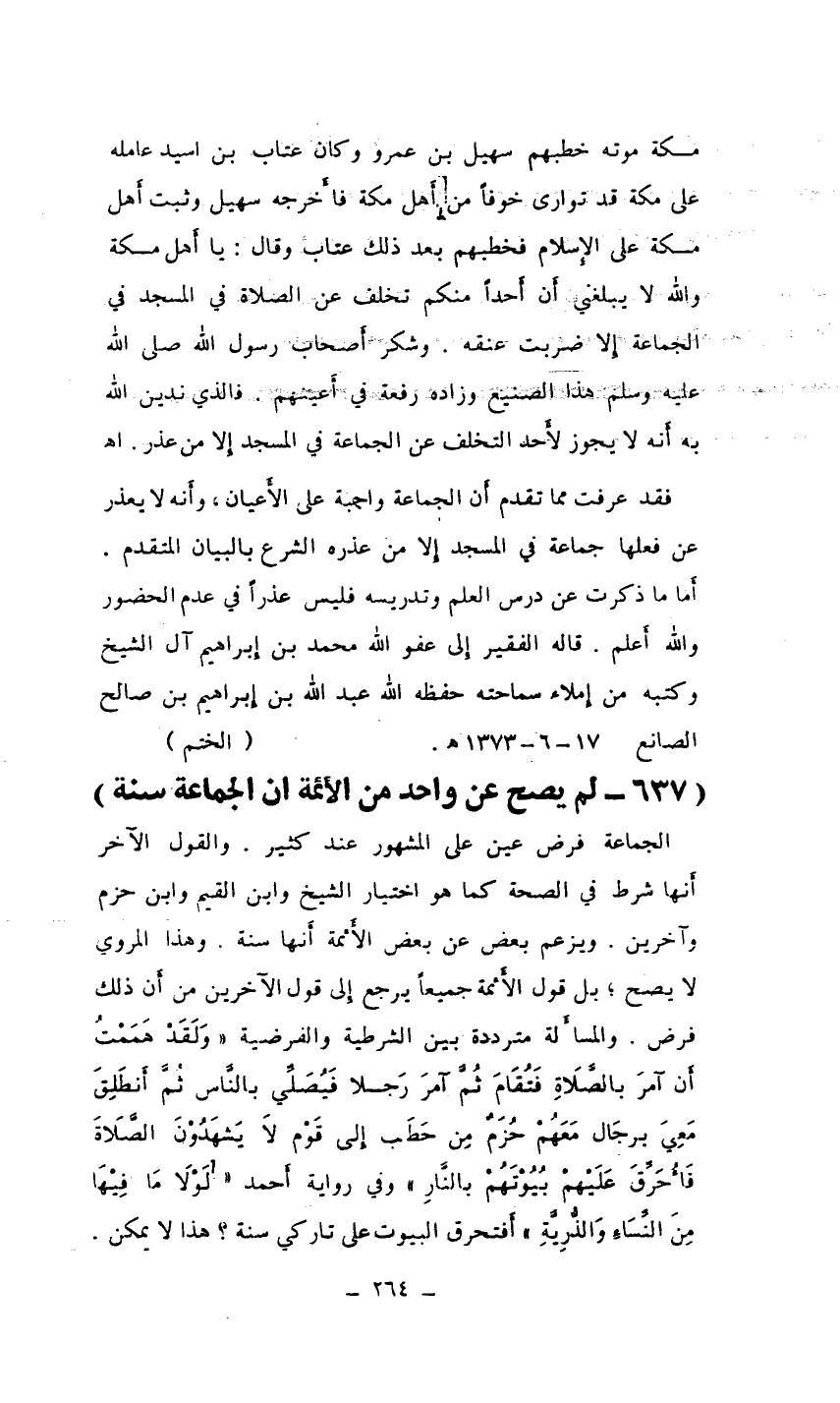637 - لم يصح عن واحد من الأئمة أن الجماعة سنة