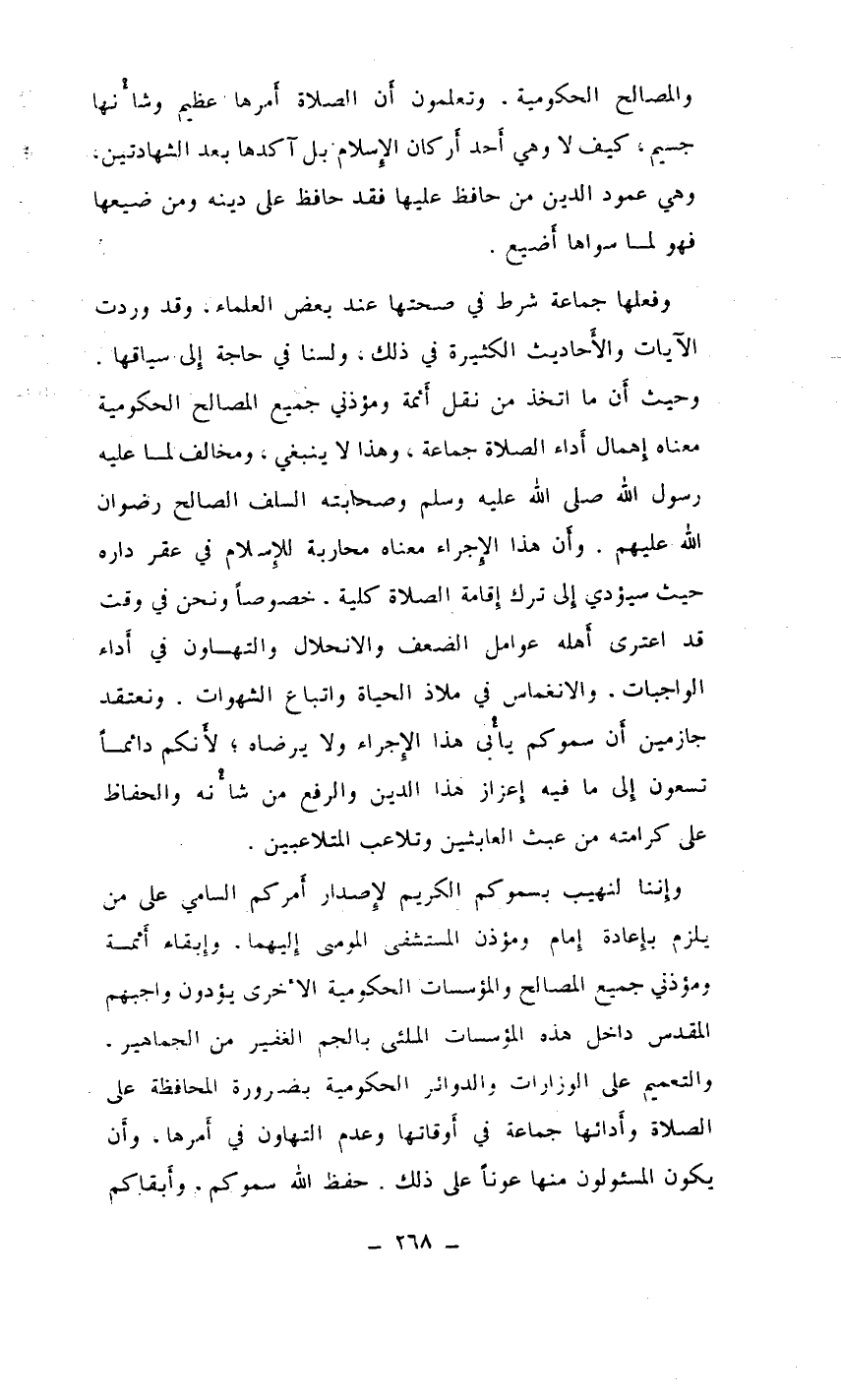 وفعلها جماعة شرط في صحتها عند بعض العلماء. وقد وردت الآيات والأحاديث الكثيرة في ذلك، ولسنا في حاجة إلى سياقها. وحيث أن ما اتخذ من نقل أئمة ومؤذني جميع المصالح الحكومية معناه إهمال أداء الصلاة جماعة، وهذا لا ينبغي، ومخالف لما عليه رسول اله صلى الله عليه وسلم وصحابته السلف الصالح رضوان الله عليهم. وأن هذا الإجراء معناه محاربة للإسلام في عقر داره حيث سيؤدي إلى ترك إقامة الصلاة كلية، خصوصاً ونحن في وقت قد اعترى أهله عوامل الضعف والانحلال والتهاون في أداء الواجبات. والانغماس في ملاذ الحياة واتباع الشهوات. ونعتقد جازمين أن سموكم يأتي هذا الإجراء ولا يرضاه، لأنكم دائماً تسعون إلى ما فيه إعزاز هذا الدين والرفع من شانه والحفاظ على كرامته من عبق العابثين وتلاعن المتلاعبين.