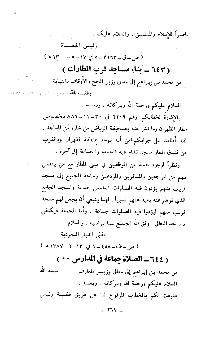 ونظراً لوجود جملة من الموظفين في مبنى المطار مع من يتصل بهم من المراجعين والمسافرين والمودعين وحاجة الجميع إلى مسجد قريب منهم يؤدون فيه الصلوات الخمس جماعة والمسجد الجامع الذي نوهتم عنه بعيد عنهم نسبياً. لهذا ينبغي أن يجعل لهم مسجد قريب منهم ليؤدوا فيه الصلوات جماعة. وأما الجمعة فيكتفي بالمسجد الحالي. وفق الله الجميع لما يرضيه. والسلام.