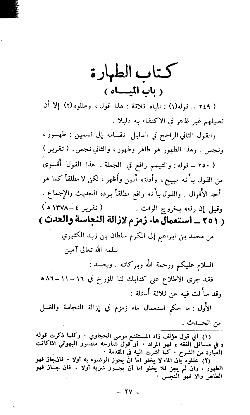 (249- قوله (¬1) : المياه ثلاثة: هذا قول، وعللوه (¬2) إِلا أن تعليلهم غير ظاهر في الاكتفاء به دليلا.