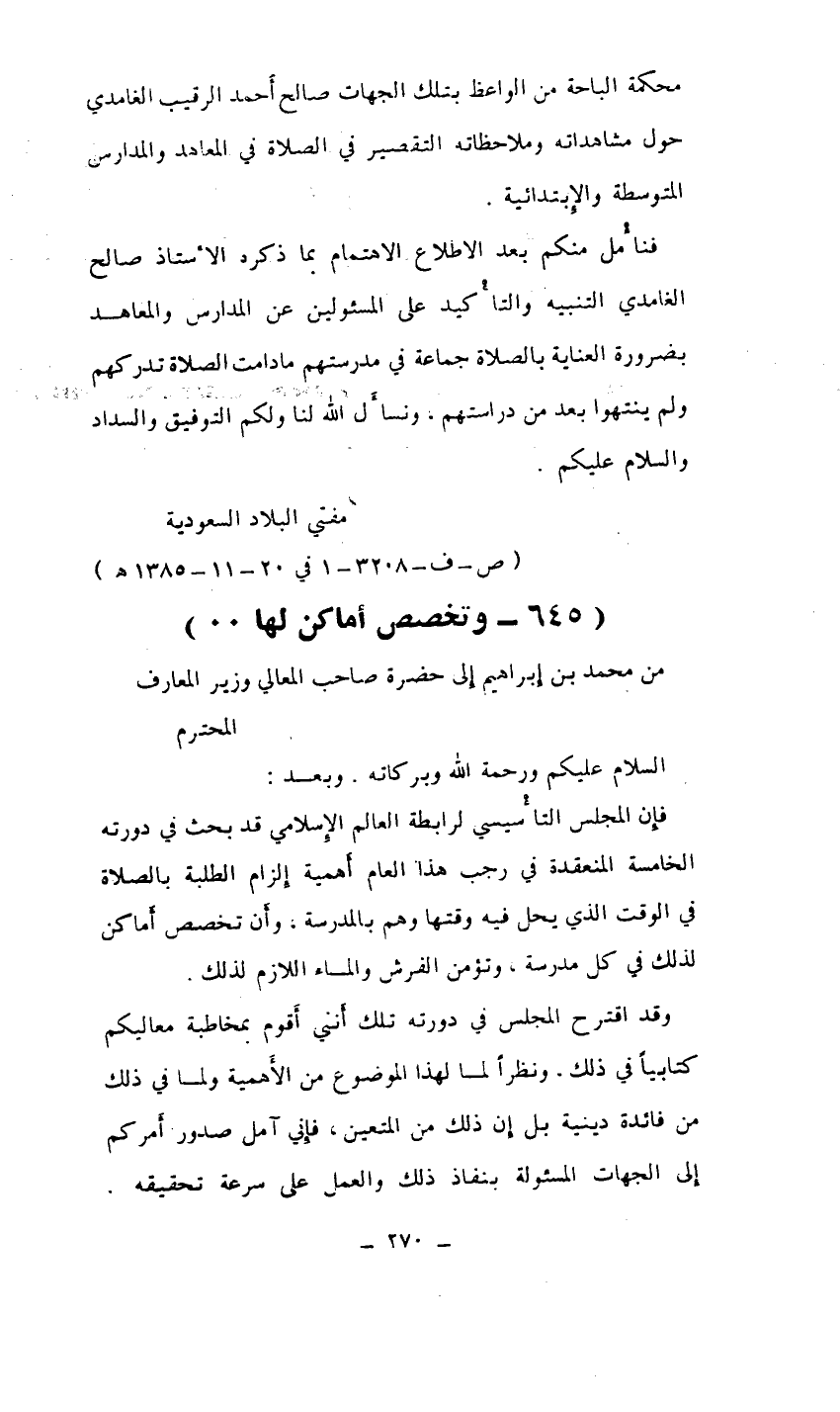 فنأمل منكم بعد الإطلاع الاهتمام بما ذكره الأستاذ صالح الغامدي التنبيه والتأكيد على المسئولين عن المدارس والمعاهد بضرورة العناية بالصلاة جماعة في مدرستهم ما دامت الصلاة تدركهم ولم ينتهوا بعد من دراستهم. ونسأل الله لنا ولكم التوفيق والسداد. والسلام عليكم.