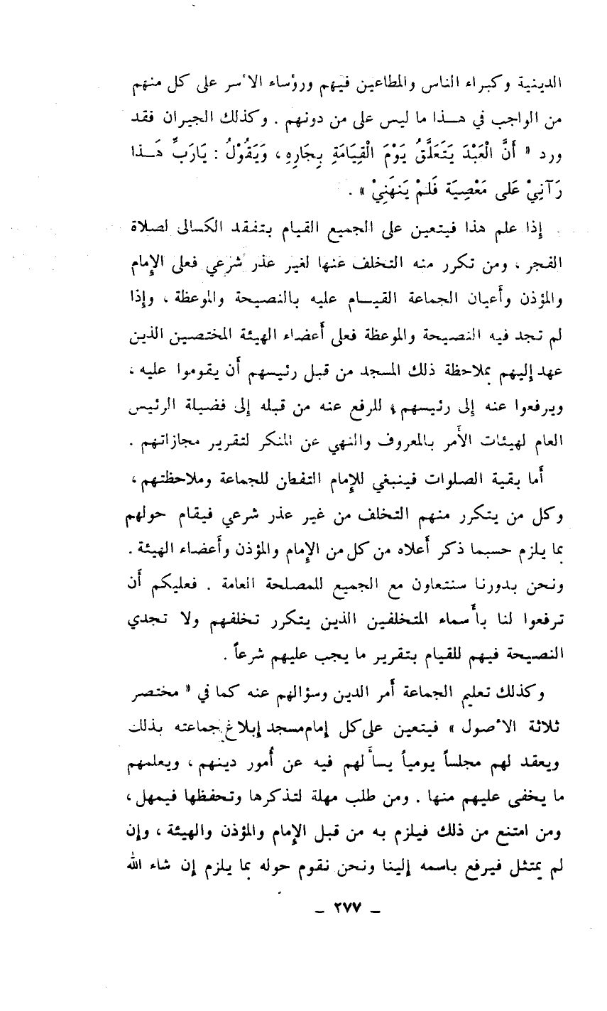وكذلك تعليم الجماعة أمر الدين وسؤالهم عنه كما في " مختصر ثلاثة الأصول " فيتعين على كل إمام مسجد إبلاغ جماعته بذلك ويعقد لهم مجلساً يومياً يسألهم فيه عن أمور دينهم، ويعلمهم ما يخفى عليهم منها. ومن طلب مهلة لتذكرها وتحفظها فيمهل، ومن امتنع من ذلك فيلزم به من قبل الإمام والمؤذن والهيئة، وإن لم يمتثل فيرفع باسمه إلينا ونحن نقوم حوله بما يلزم إن شاء الله