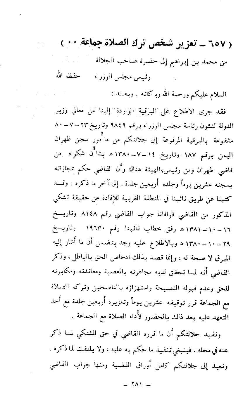 فقد جرى الاطلاع على البرقية الواردة إلينا من معالي وزير الدولة لشئون رئاسة مجلس الوزراء برقم 9849 وتاريخ 23/7/80 مشفوعة بالبرقية المرفوعة إلى جلالتكم من مأمور سجن ظهران اليمن برقم 187 وتاريخ 14/7/1380هـ بشأن شكواه من قاضي ظهران ومن رئيس الهيئة هناك وأن القاضي حكم بمجازاته بسجنه عشرين يوماً وجلده أربعين جلدة. إلى آخر ما ذكره. وقد كتبنا عن طريق نائبنا في المنطقة الغربية للإفادة عن حقيقة تشكي المذكور من القاضي فوافانا جواب القاضي رقم 8148 وتاريخ 16/10/1380هـ رفق خطاب نائبنا رقم 19630 وتاريخ 29/10/1380هـ وبالاطلاع عليه وجد يتضمن أن ما أشار إليه المبرق لا صحة له / وإنما قصد بذلك ادحاض الحق بالباطل، وذكر القاضي أنه لما تحقق لديه مجاهرته بالمعصية ومعاندته ومكابرته للحق وعدم قبوله النصيحة واستهزاؤه بالناصحين وتركه الصلاة مع الجماعة قرر توقيفه عشرين يوماً وتعزيره أربعين جلدة مع أخذ التعهد عليه بعد ذلك بالحضور لأداء الصلاة مع الجماعة.