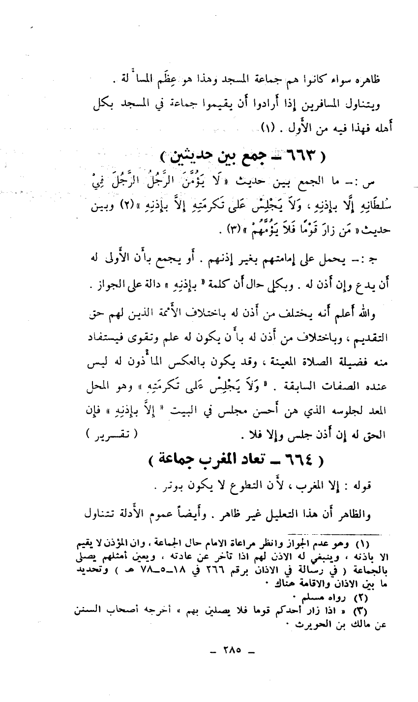 (¬1) وهو عدم الجواز وانظر مراعاة الإمام حال الجماعة، وانالمؤذن لا يقيم إلا بإذنه، وينبغي له الاذن لهم إذا تأخر عن عادته، ويعين أمثلهم يصلي بالجماعة (في رسالة في الاذان برقم 266 في 18/5/78هـ) وتحديد ما بين الاذان والاقامة هناك.